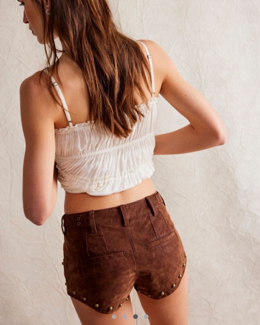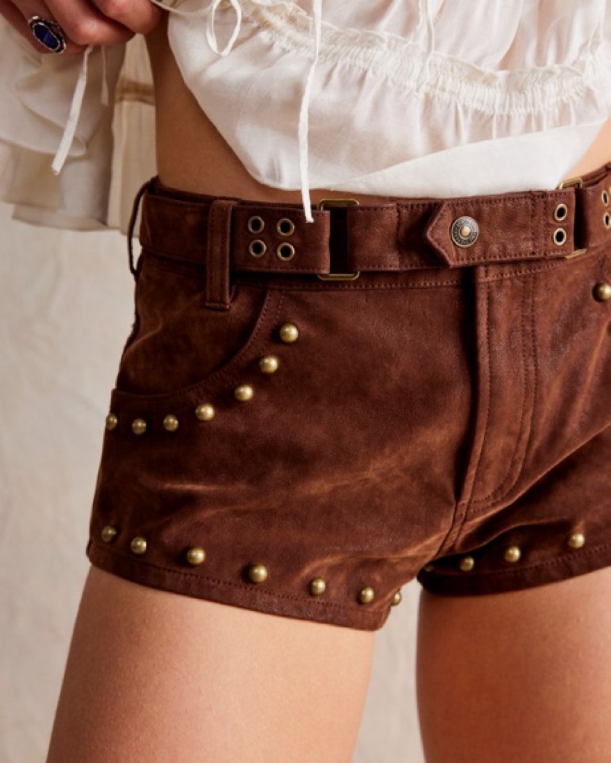 Features: Soft vegan suede fabrication, zip fly and offset button closure, four-pocket design, studded embellishments & grommets at the waistband Why