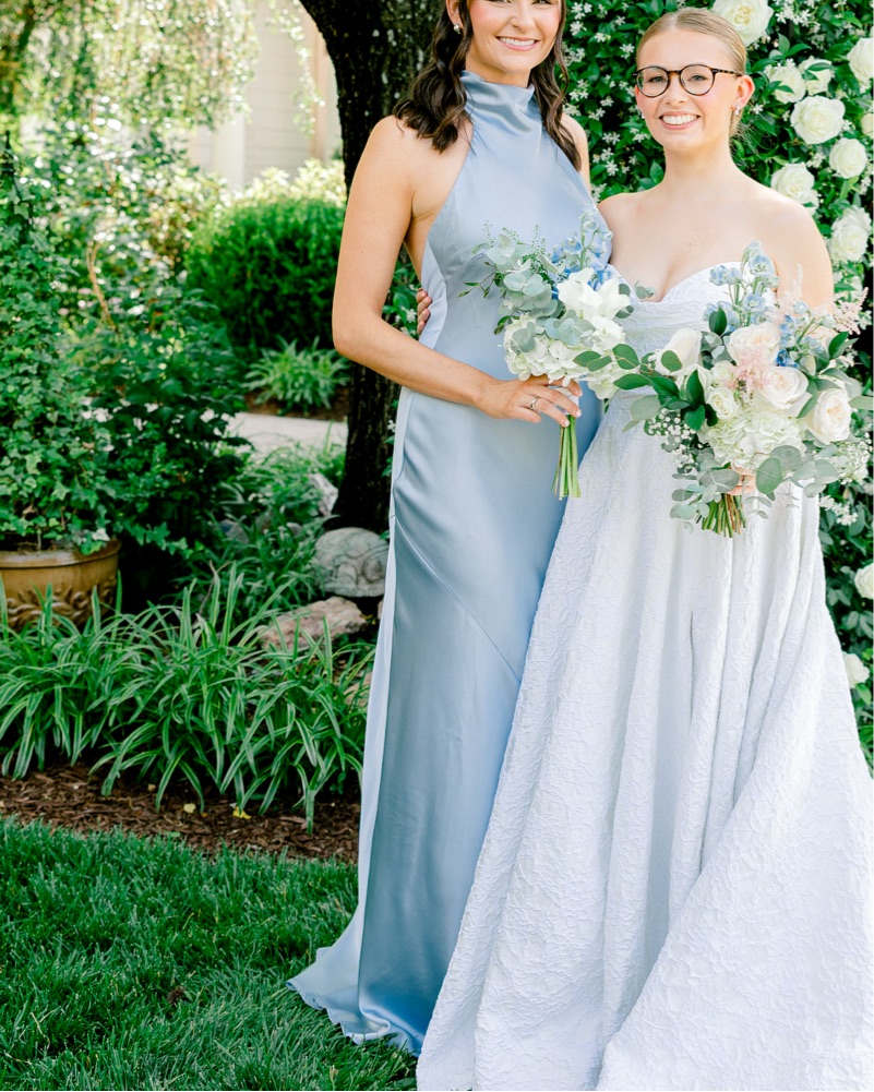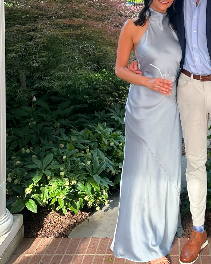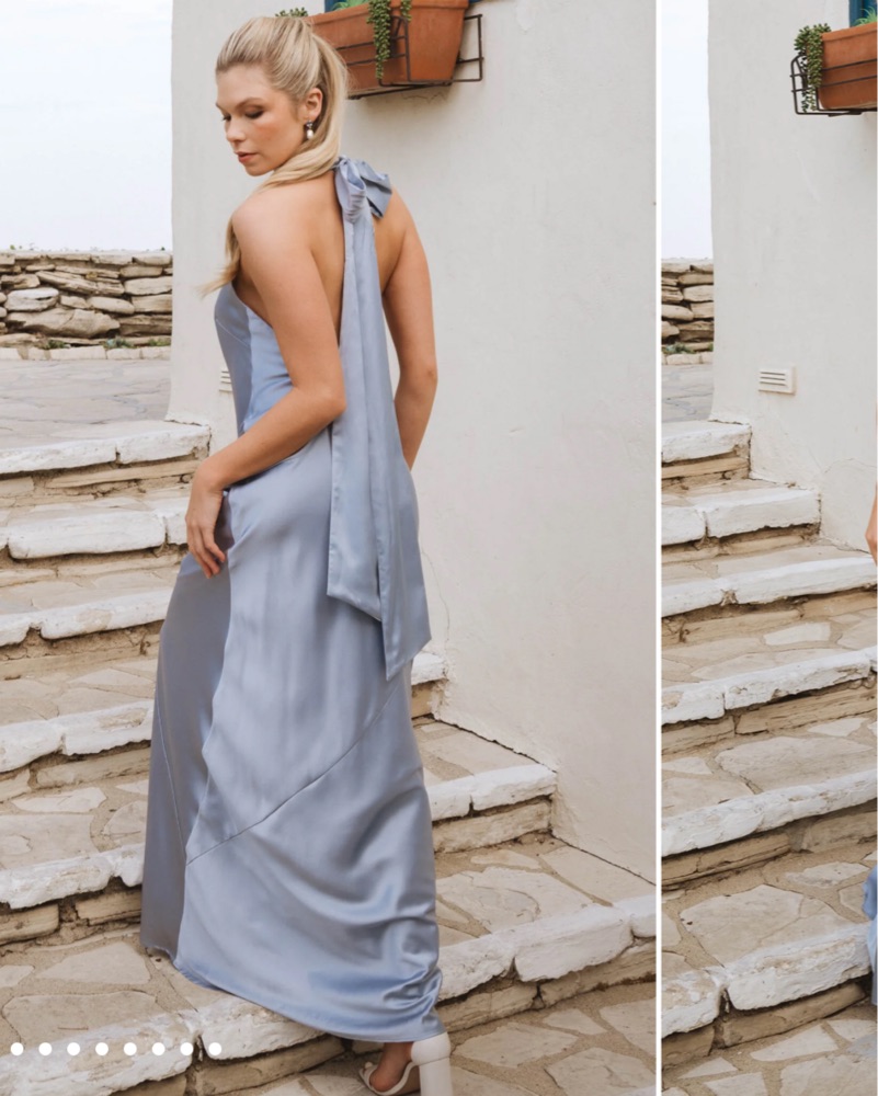 Color is Steel Blue Luxe Satin. So many compliments and you can wear the neck tie in a bow or just a knot like I did!