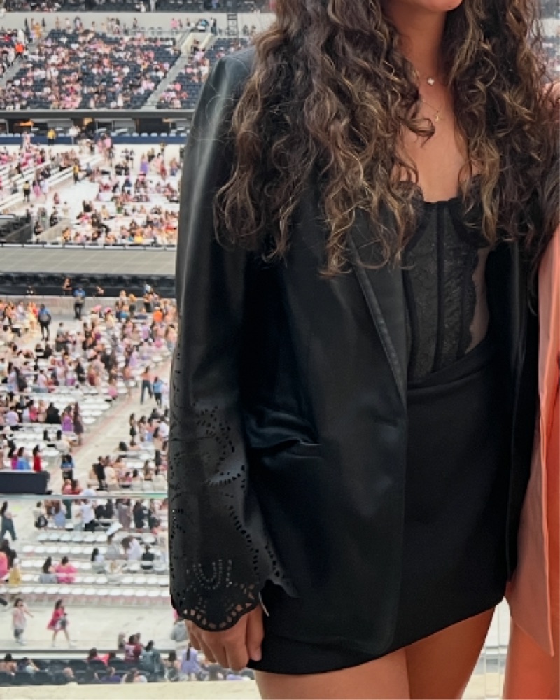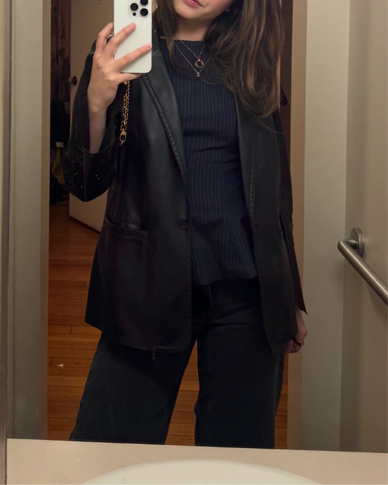 Size M. The perfect cutout leather blazer to wear over a dress or a top. Fits S/M.