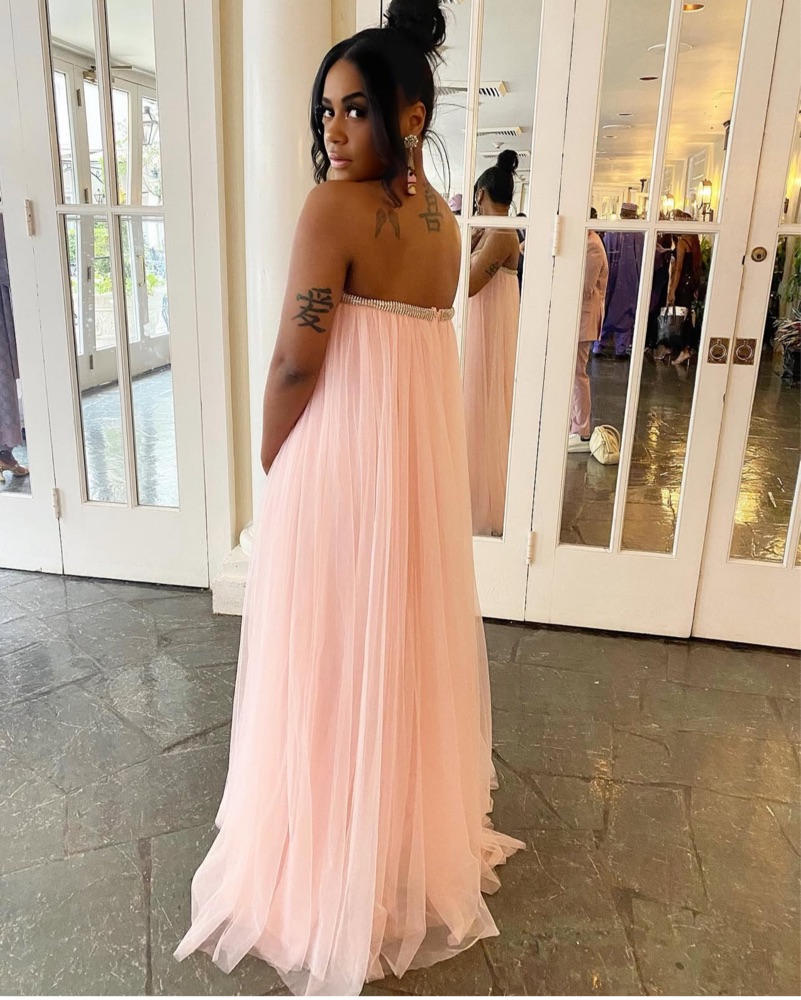 This stunning blush tulle gown is perfect for a formal event or special occasion. The shimmering embellished bodice and flowing skirt create a truly elegant look.
