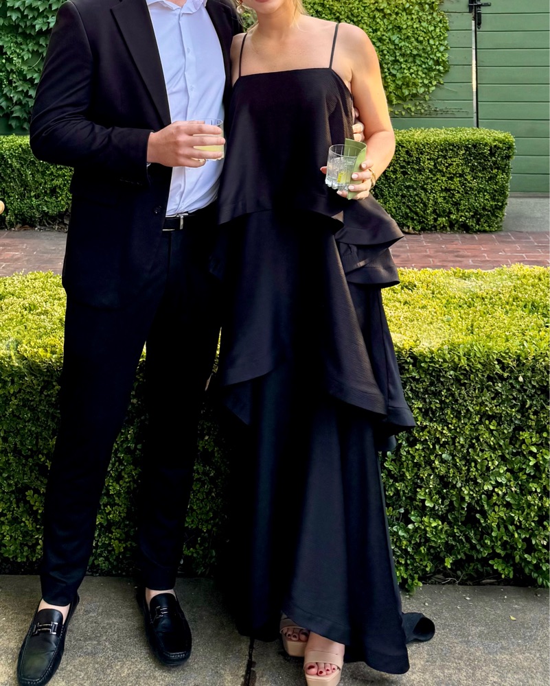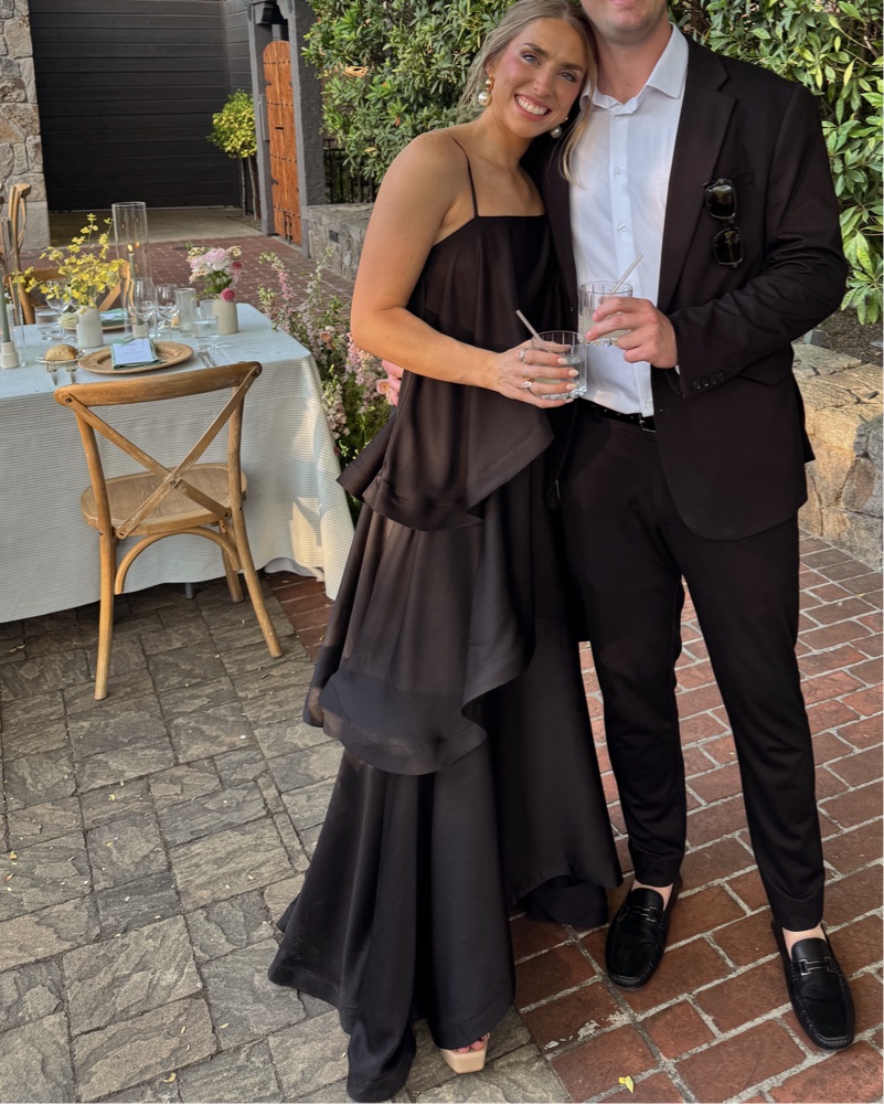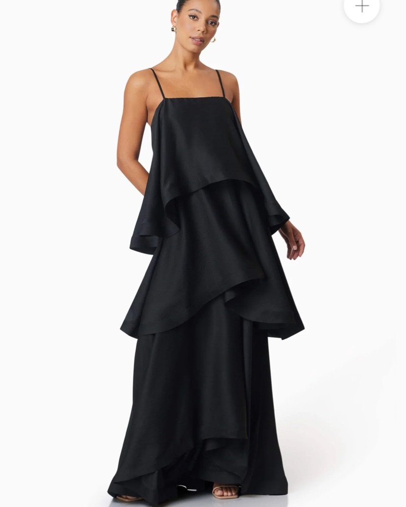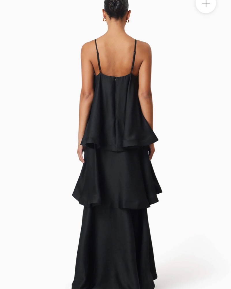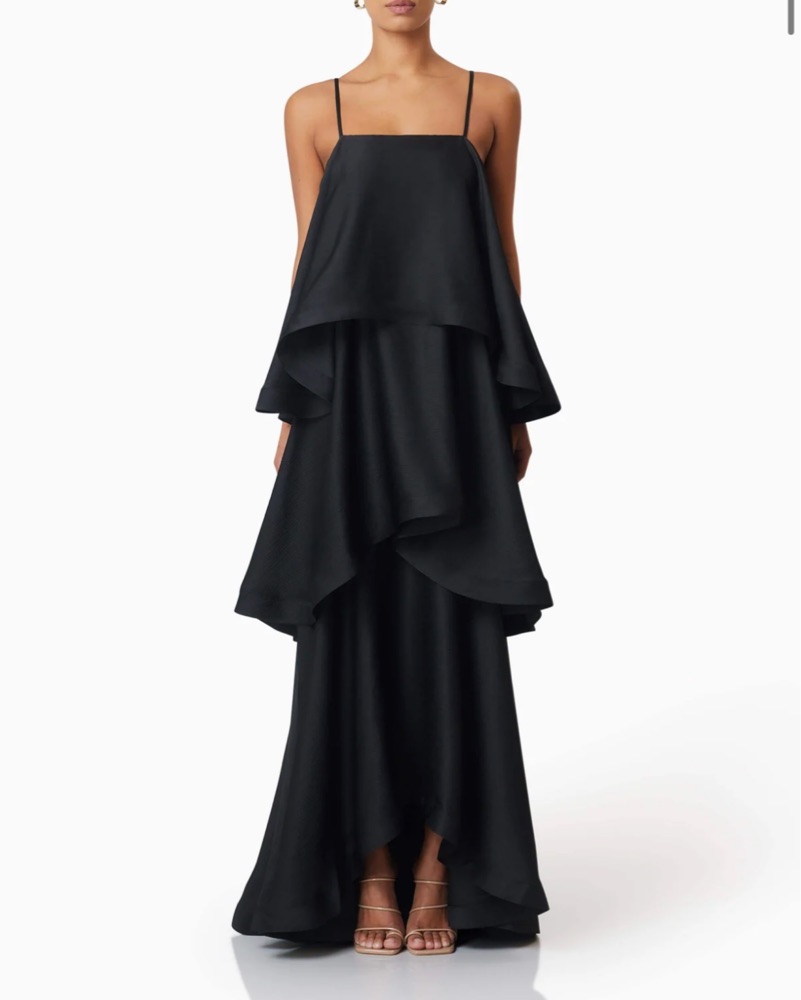 Elliott Tilly Tiered Maxi Dress in black. Adjustable straps