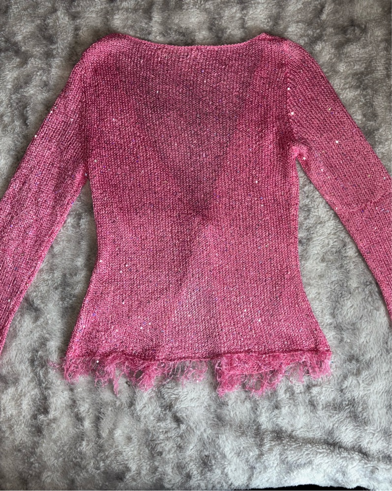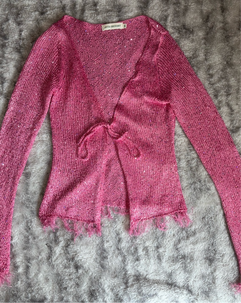 This vibrant pink cardigan is the perfect pop of color to elevate any outfit. The soft, shimmering knit fabric and fringe trim add a touch of glamour.