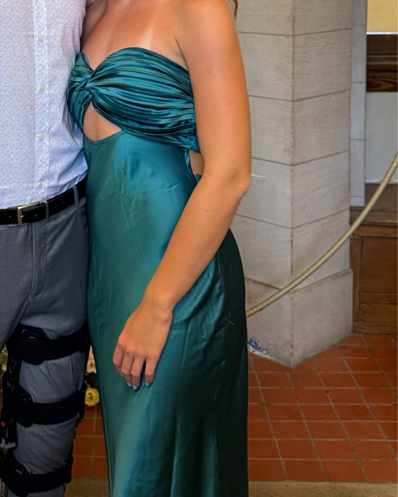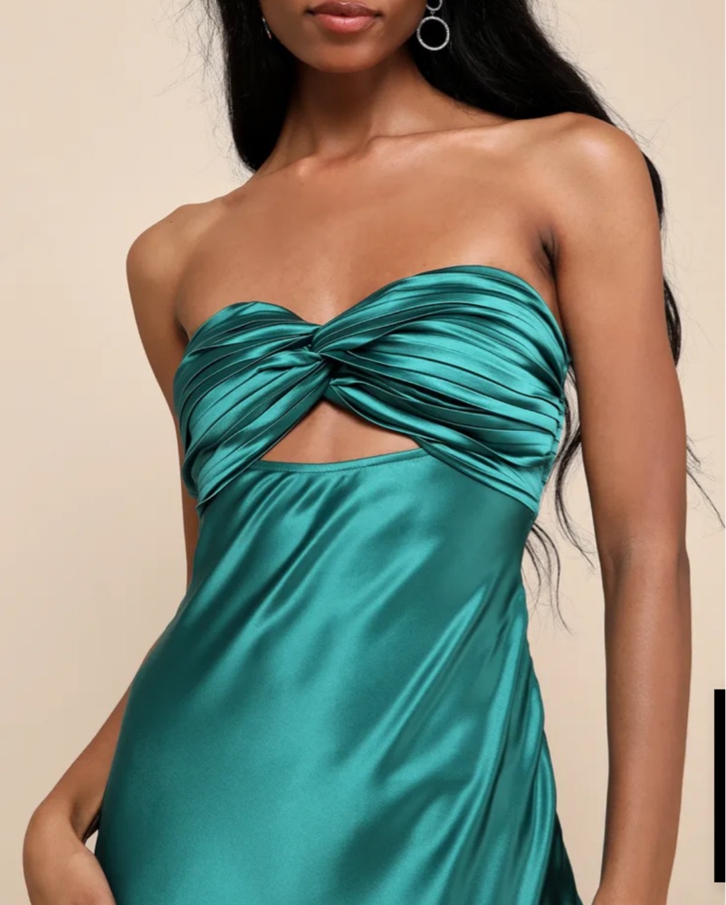This stunning turquoise satin gown is perfect for a formal event or special occasion. The draped, twisted bodice and floor-length silhouette create an elegant, glamorous look.