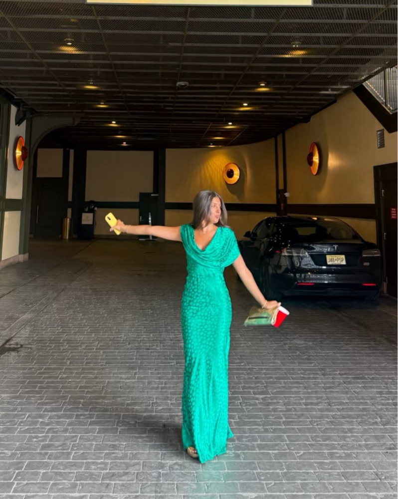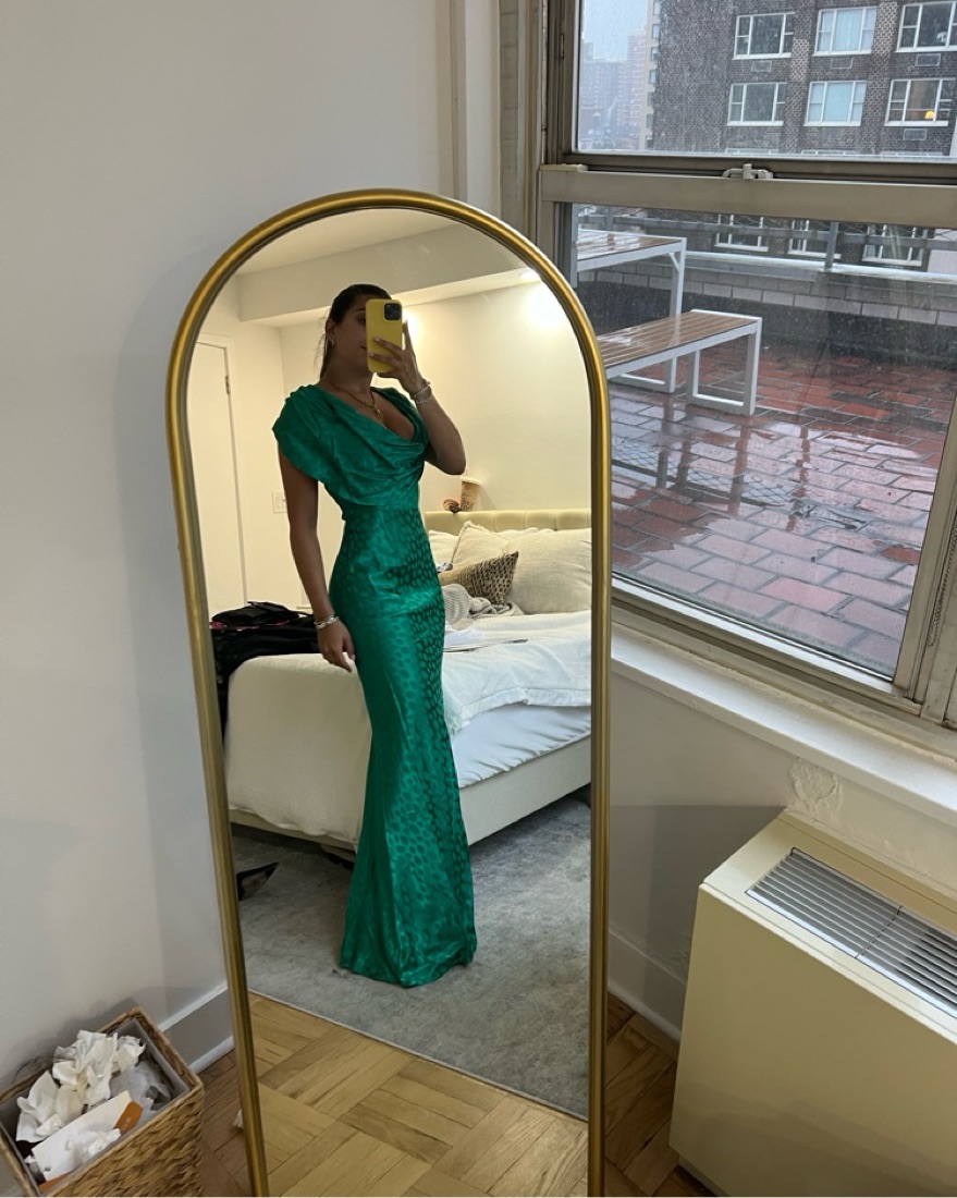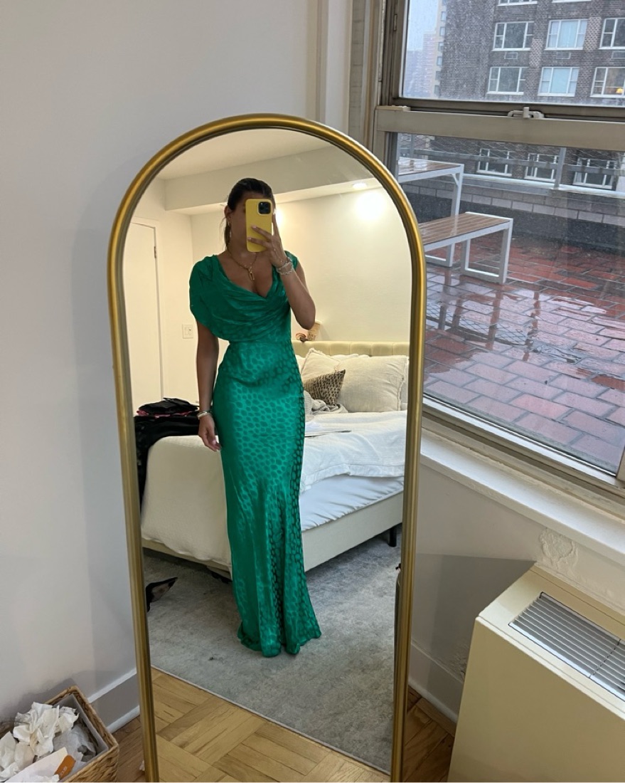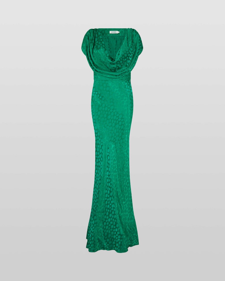 Stunning floor length gown with attached cowl neck overlay. True to size and LONG (not altered) so please message about length if unsure