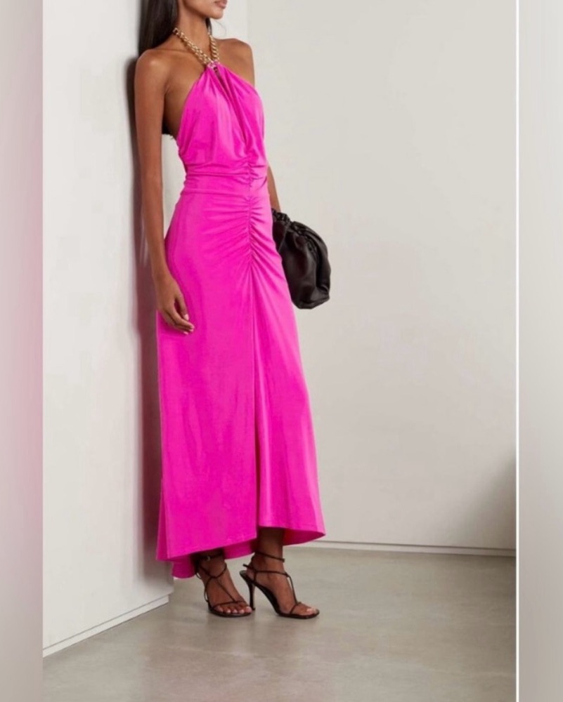 Veronica Beard’s iconic Reze Dress features a ruched stretch jersey fabric that is formal enough for any special occasion. The chain halter detail is unique and adds lovely texture.