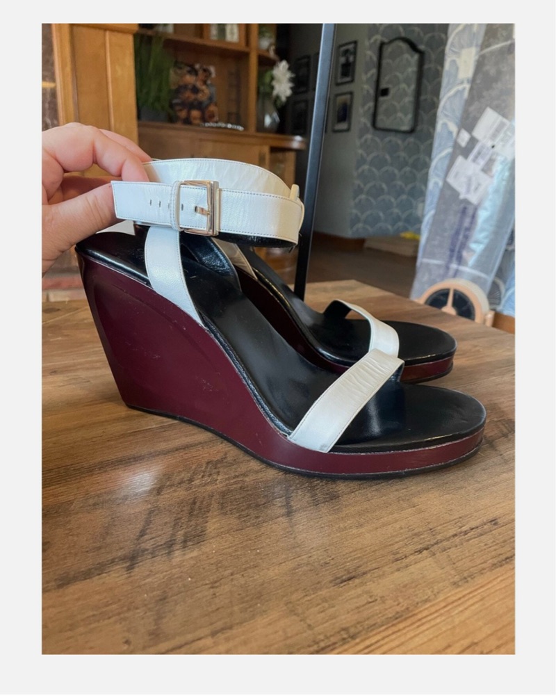Adorable Maroon and White Leather Buckle Strap 1990s Gucci Wedge Heels