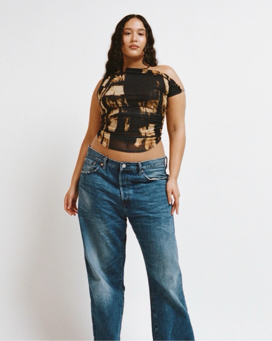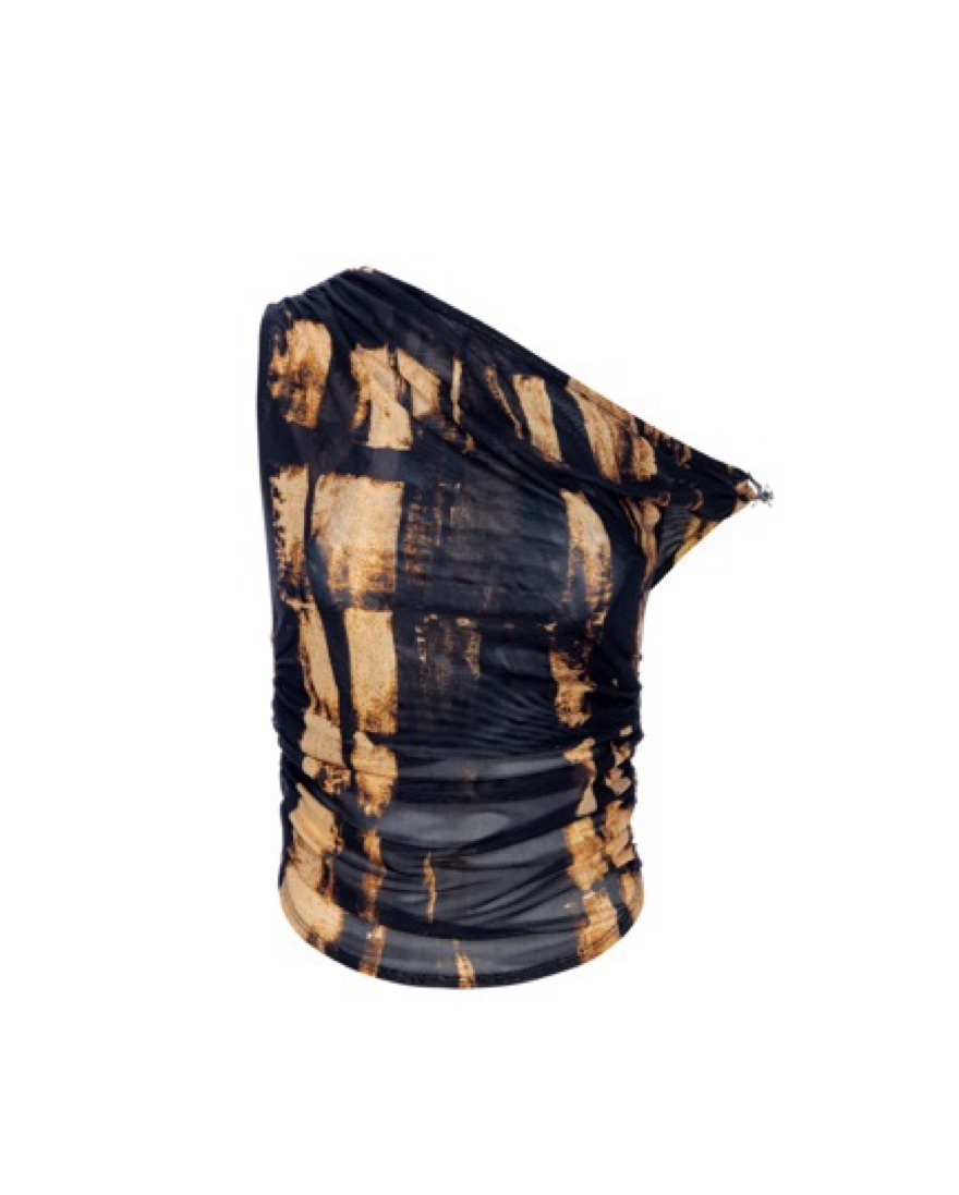 This luxurious top features a mesh fabric with a sleek black lining, adorned with hardware on the side. The cowl neckline and one-shoulder design add a touch of style. Elevate your wardrobe with this exclusive piece.