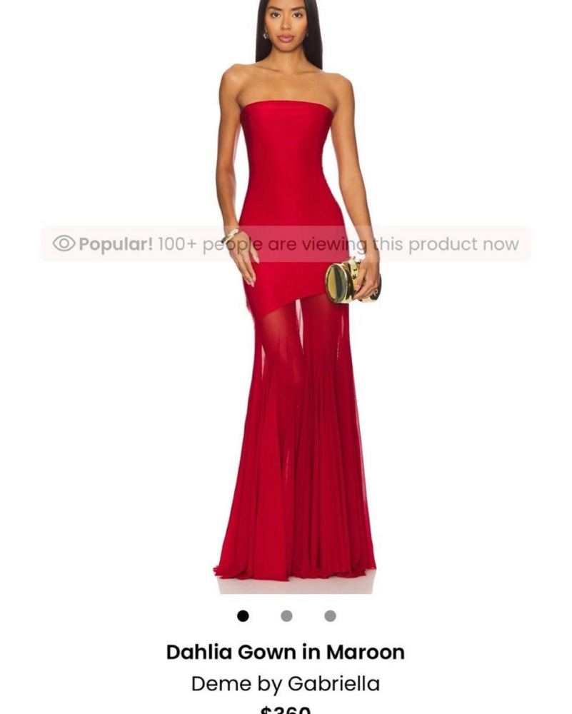 Maroon/Red strapless drop waist Deme by Gabriella. This vibrant, floor-length maroon gown with a fitted silhouette and dramatic flair is perfect for any formal event, from galas to black-tie weddings.