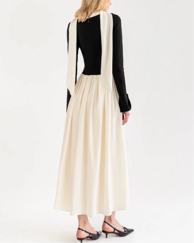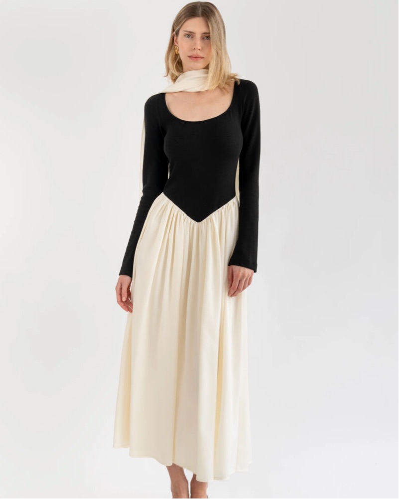 Such a pretty dress & so comfy. The scarf is attached and can be worn many ways