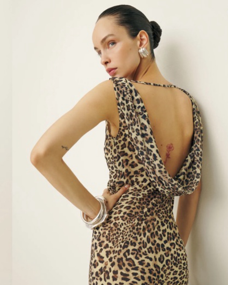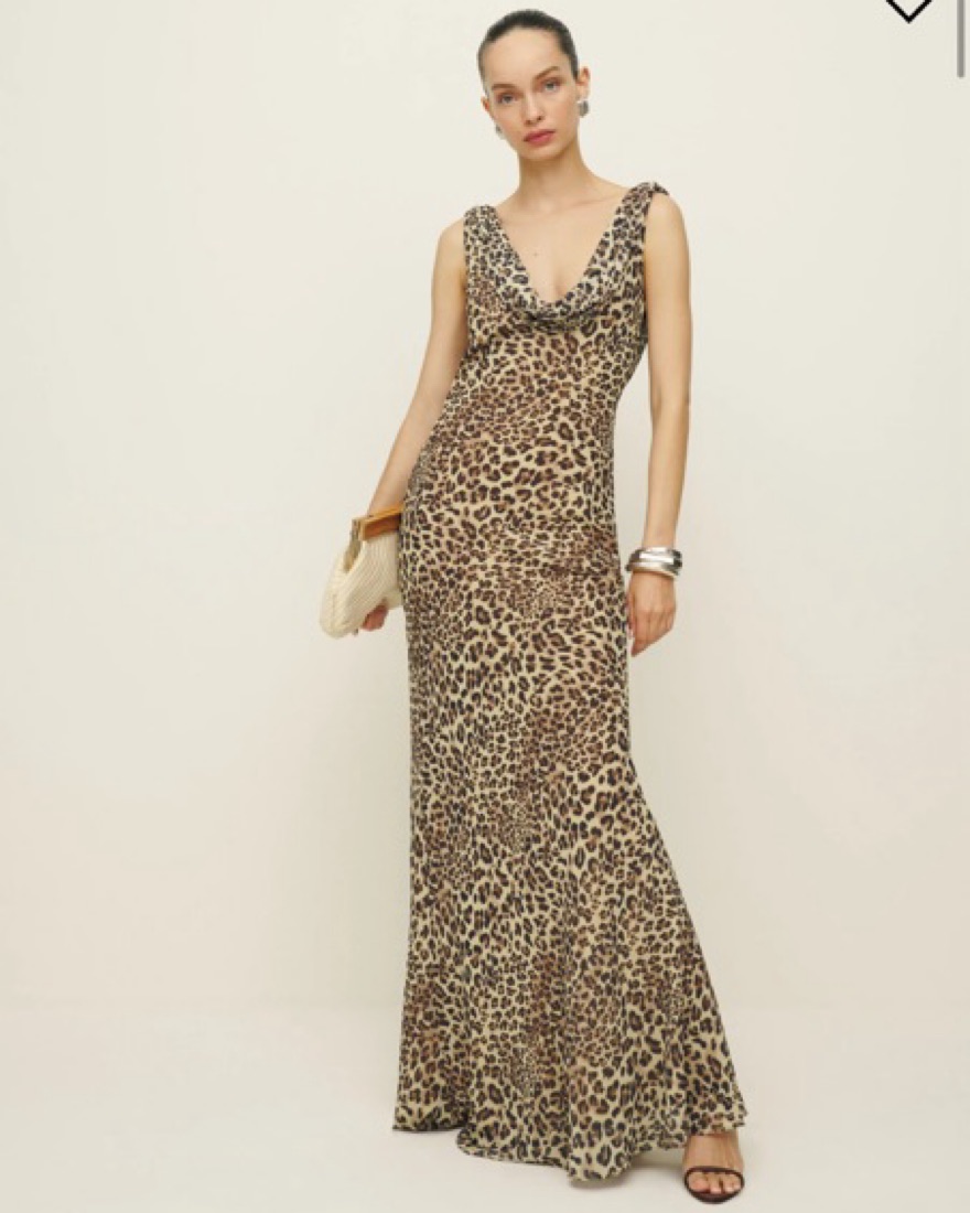 Reformation x Laura Harrier Collab. Gorg animal print gown with cowl neck and scoop back. Tags: leopard, cheetah, animal print