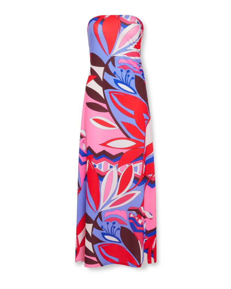 This stunning strapless maxi dress is perfect for a summer beach vacation or outdoor event. The bold and colorful tropical floral print creates a vibrant and eye-catching look.