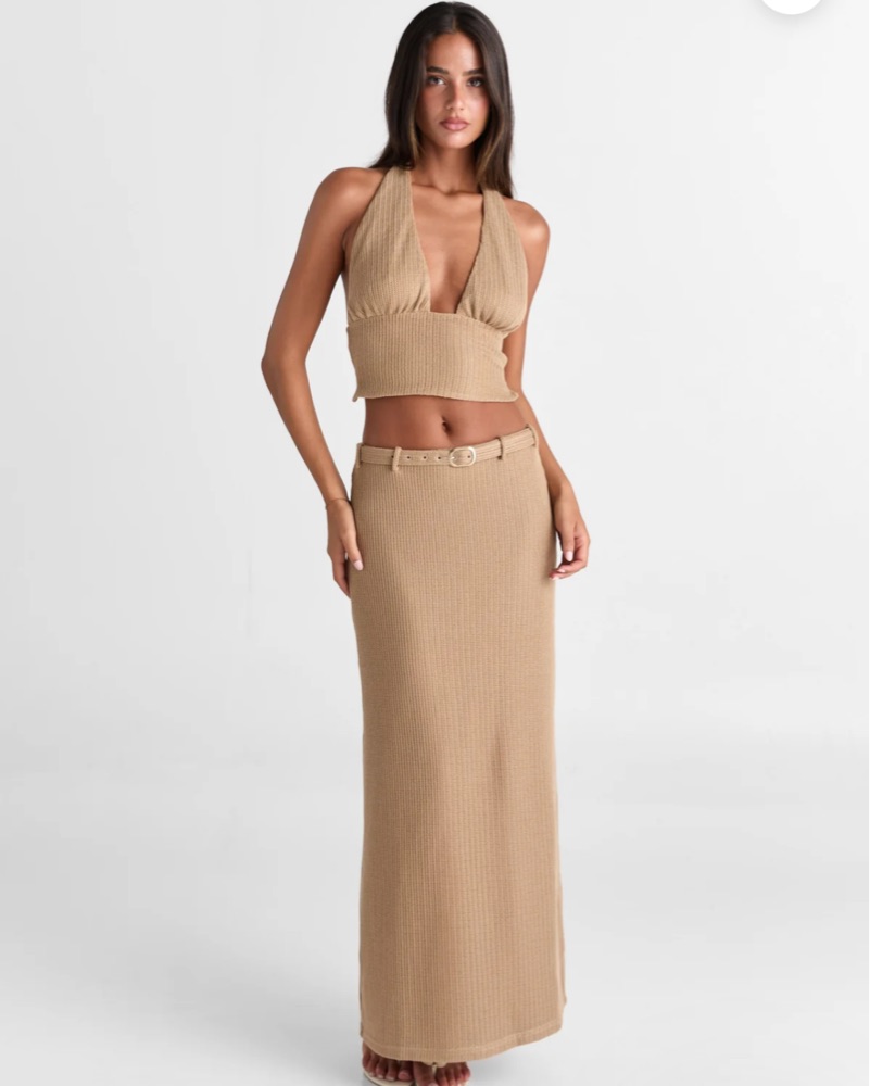 Step into elegant simplicity with this textured knit belted maxi skirt, a perfect blend of comfort and sophistication. Designed for a sleek, figure-hugging silhouette, this skirt enhances your natural curves while maintaining a relaxed and breathable feel. Top XS/Skirt S