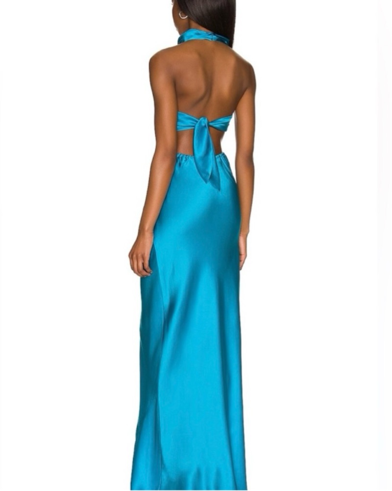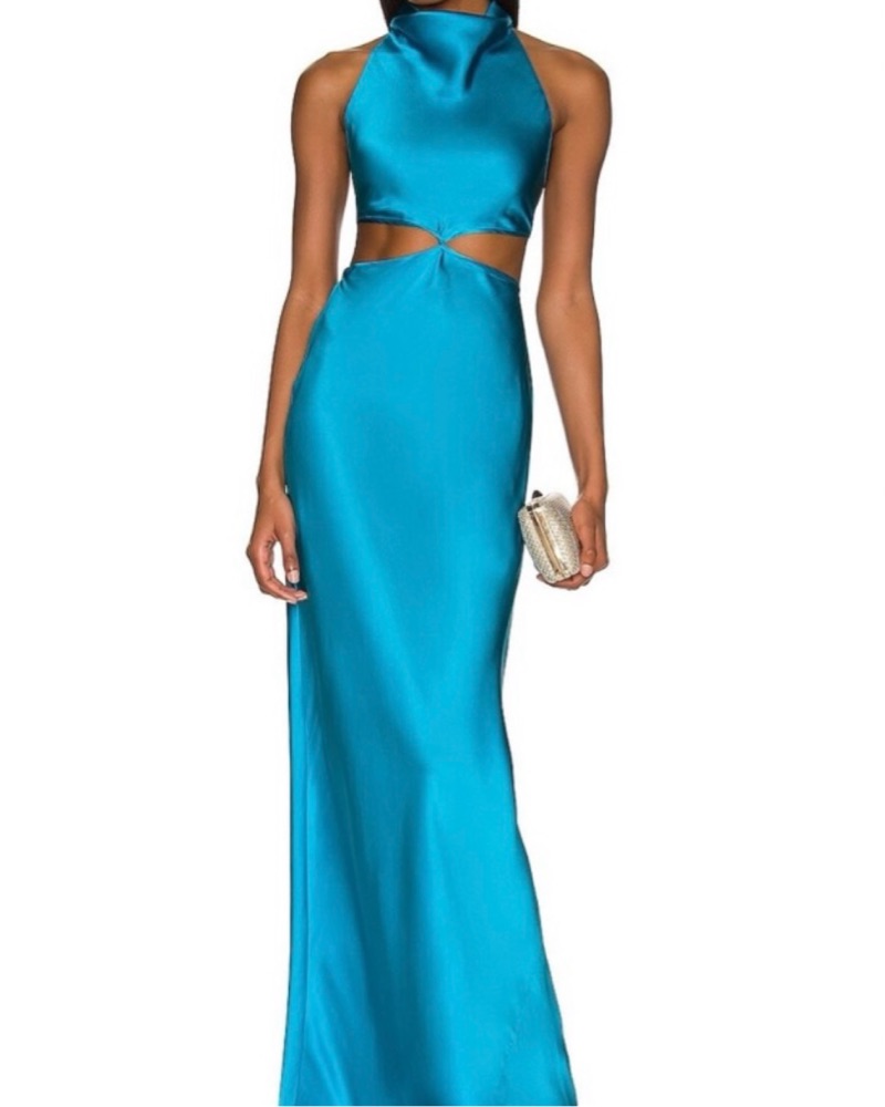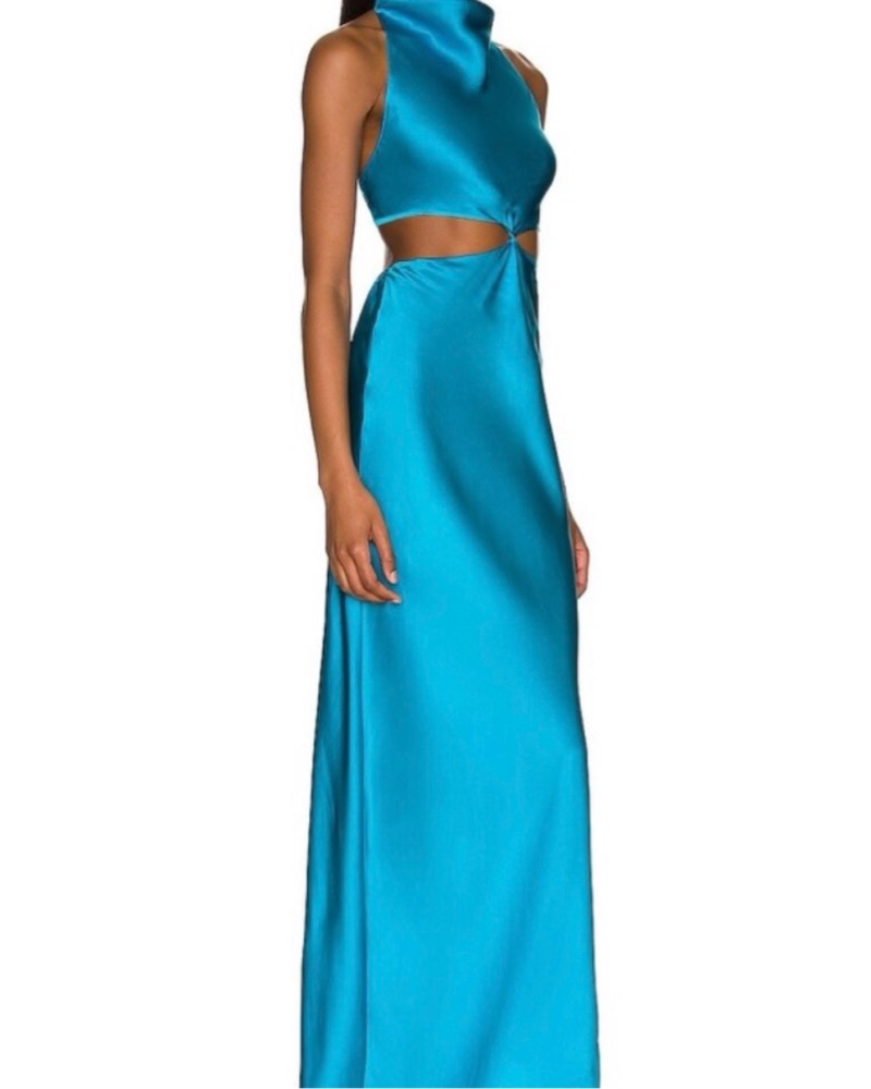 Eye-catching dress in vibrant blue that is high-necked and ties in the back. Great for summer weddings!