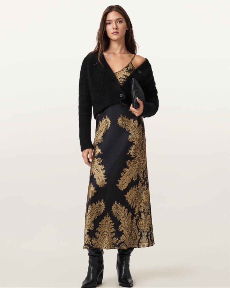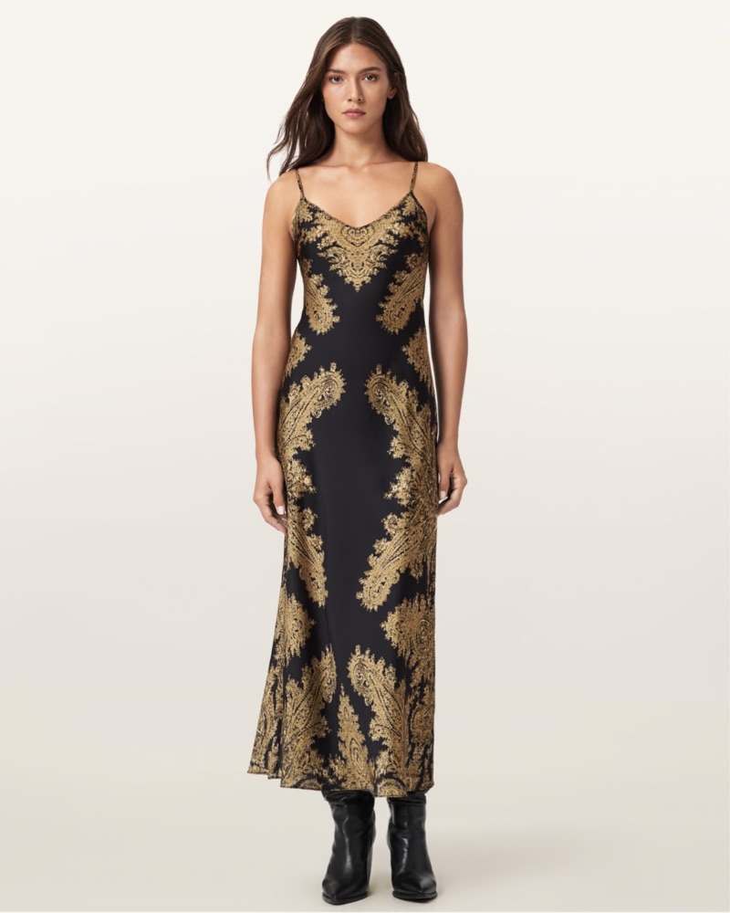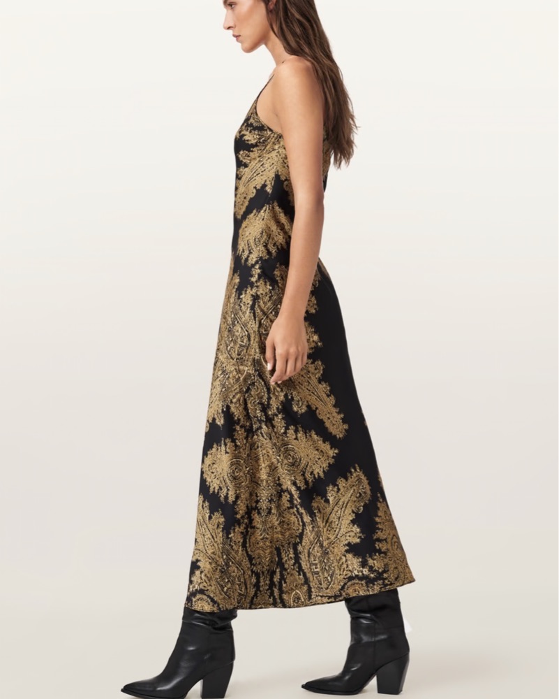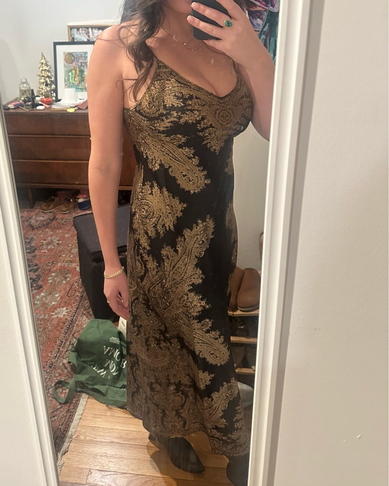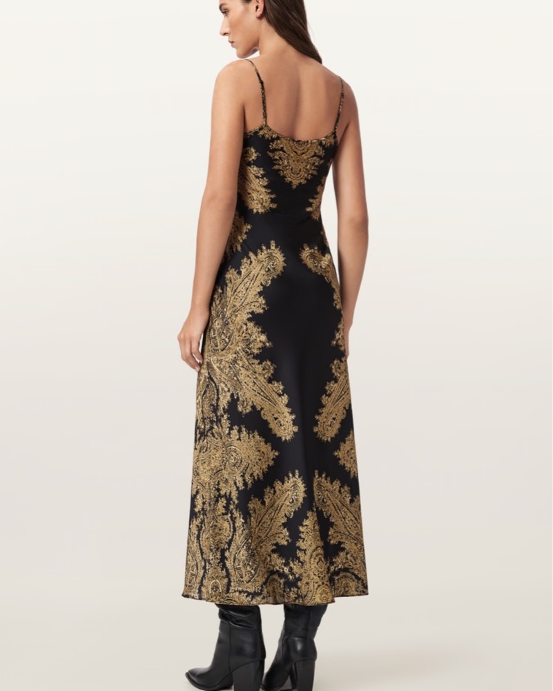 Striking black and gold detailed pattern on flowy satin dress. Perfect for date night, holiday parties and more. Looking forward to wearing this staple year round. Adjustable straps.