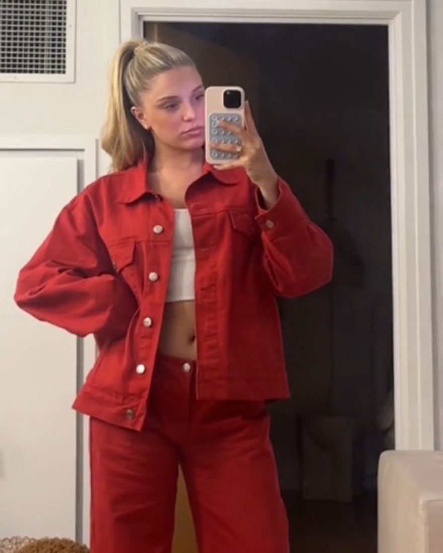 Oversized red denim jacket (S/M) and size 26 wide leg jean (low waist and super baggy) - do not dry clean or wash them!