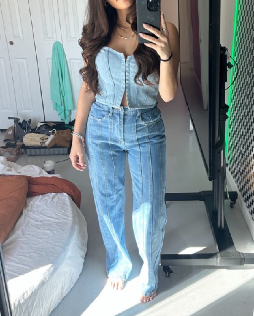 Super cute denim two piece. Worn once! Size 6 (M) can be rented together or separate!