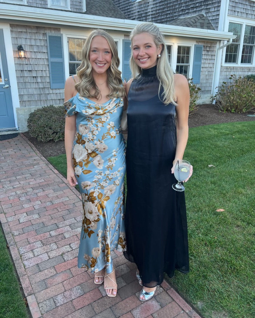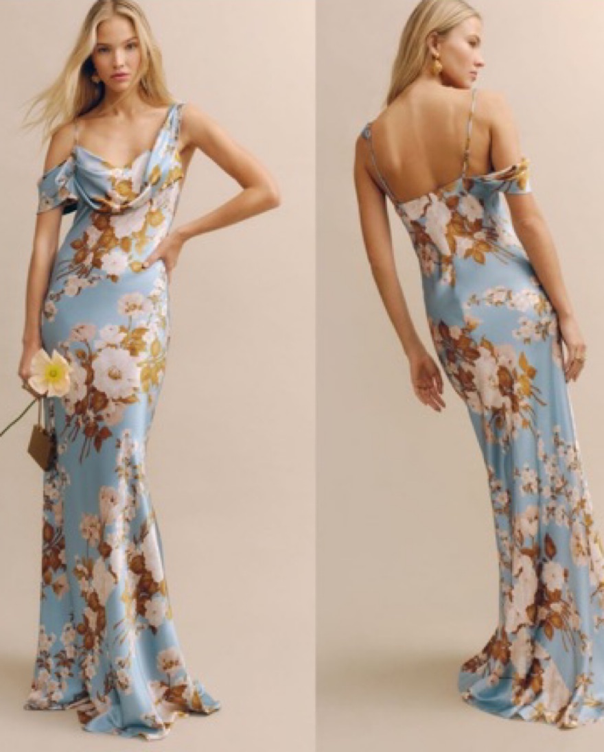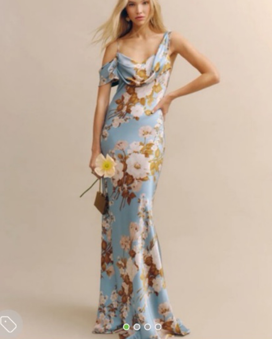 Reformation Ronda silk gown in color serene. adjustable straps, designed to be slim fitted throughout and touch the floor. I typically wear a 4, so didn’t fit me perfectly. May be best for a 2!