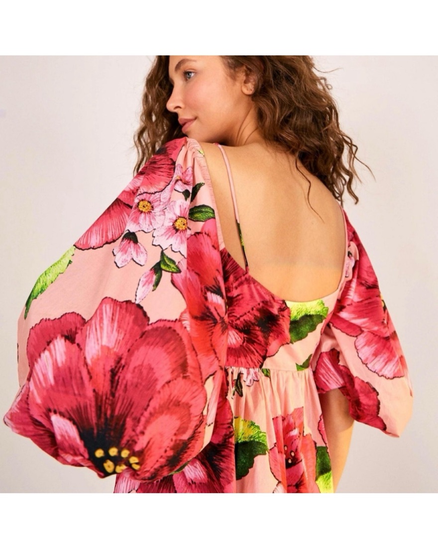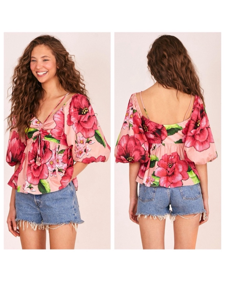 Super cute pink floral blouse! Has a side zip and beautiful puffed sleeves.