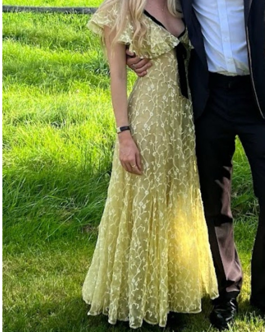 Black velvet trim, 100% yellow silk embroidered organza. Comes with yellow slip to wear underneath.