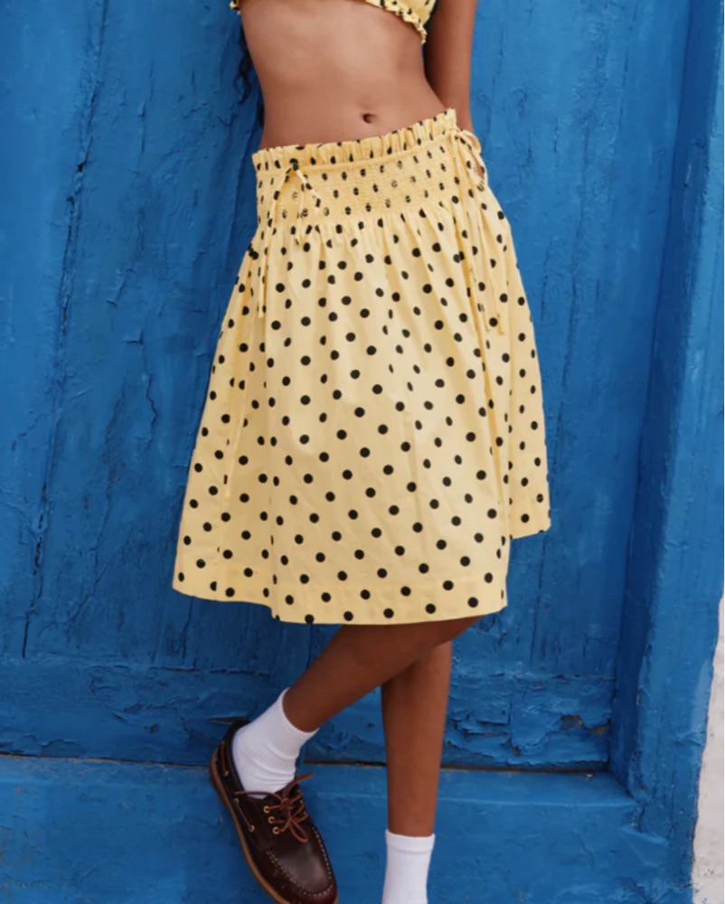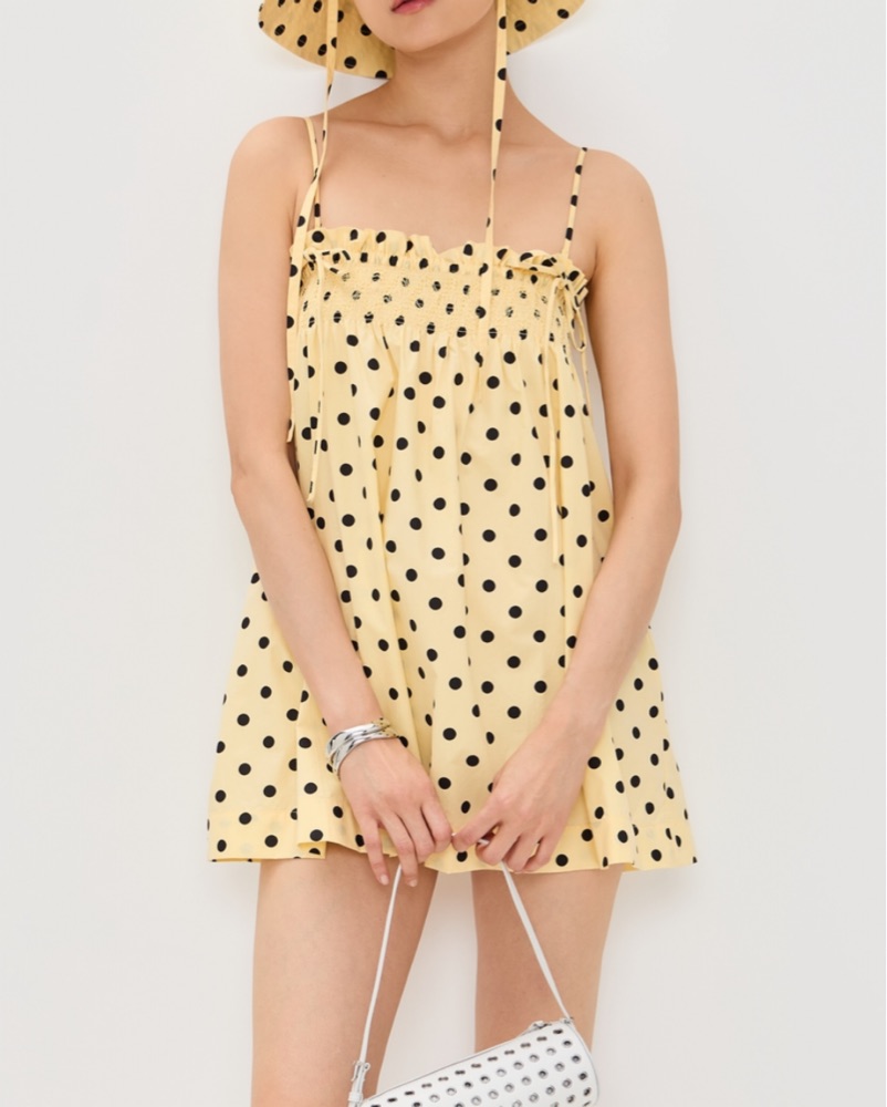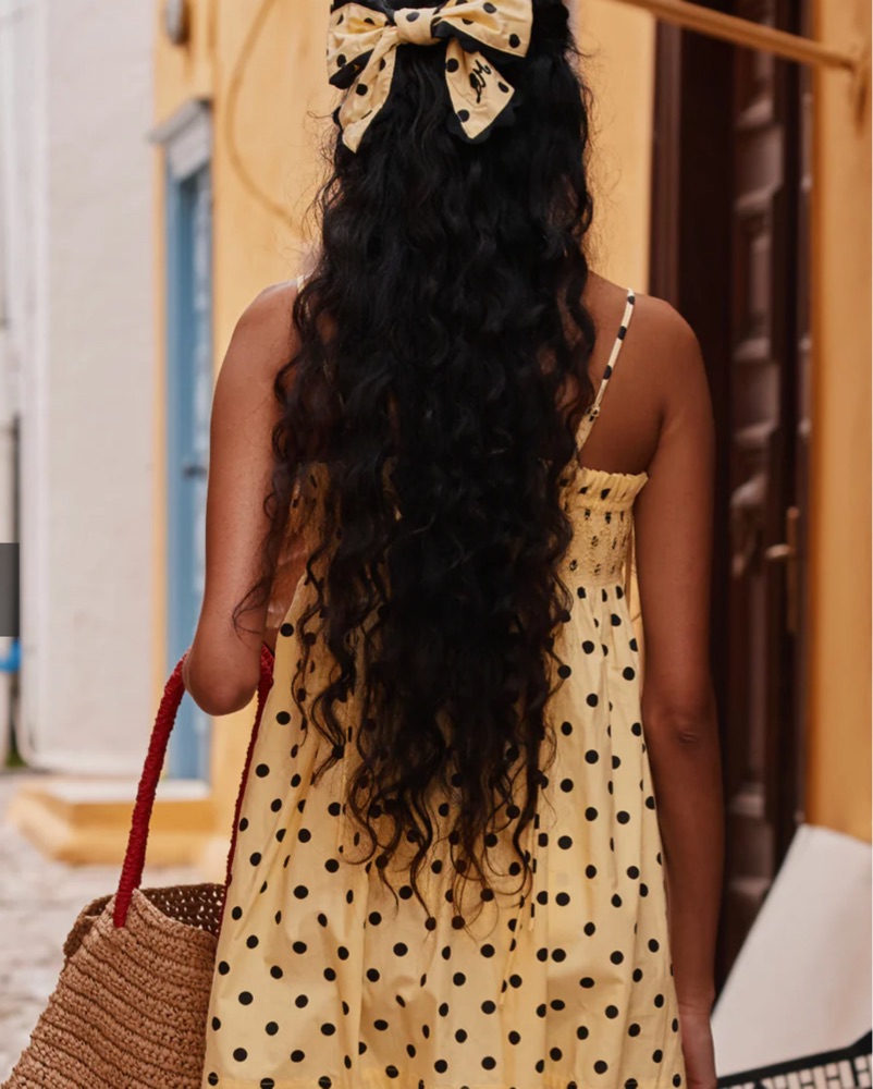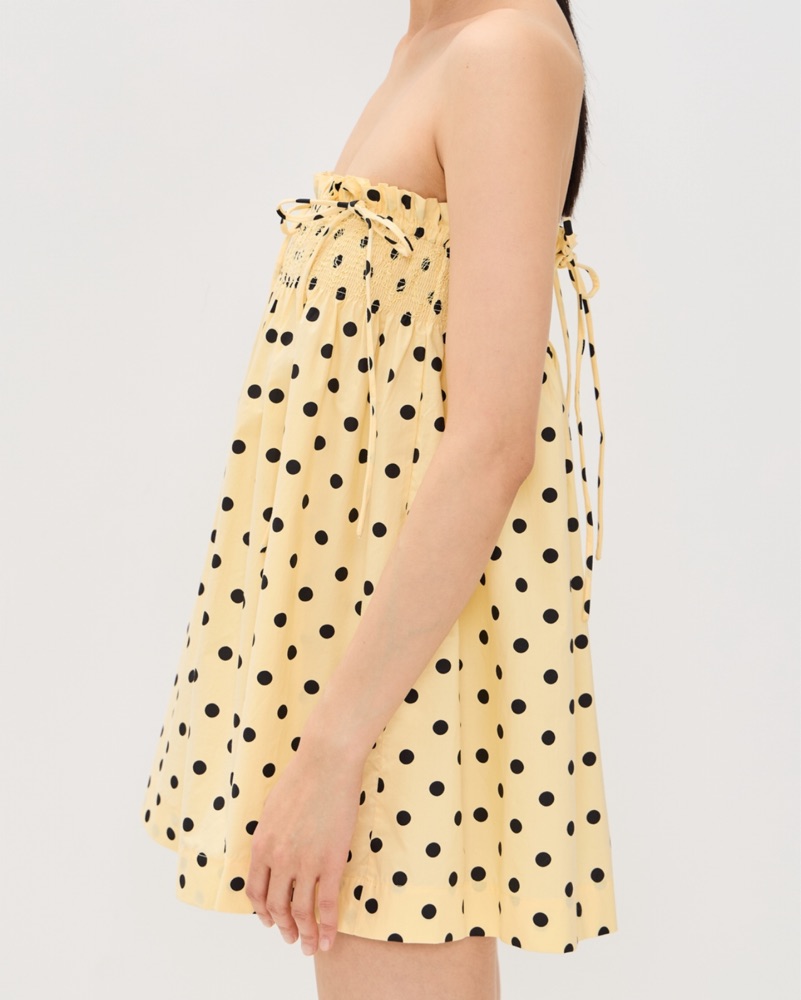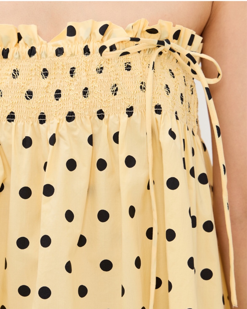 size UK 8, fits ~XS-M | color: butter spot | yellow with black polka dots | flattering smock shape | shirred bust with bow detail | can be worn strapless or even as a skirt
