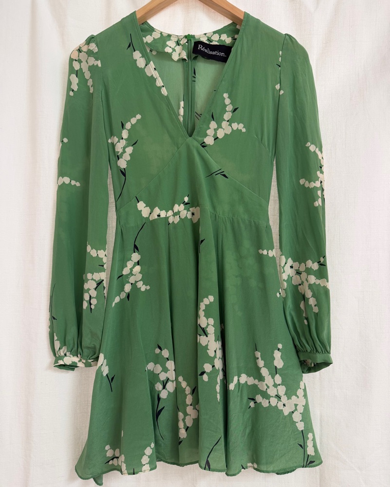 The cult Réalisation Par Kate dress in Summer Loving green floral. 100% silk, balloon sleeves, deep V, super light and flowy - perfect for spring and summer. Professionally dry cleaned, worn once 🌸