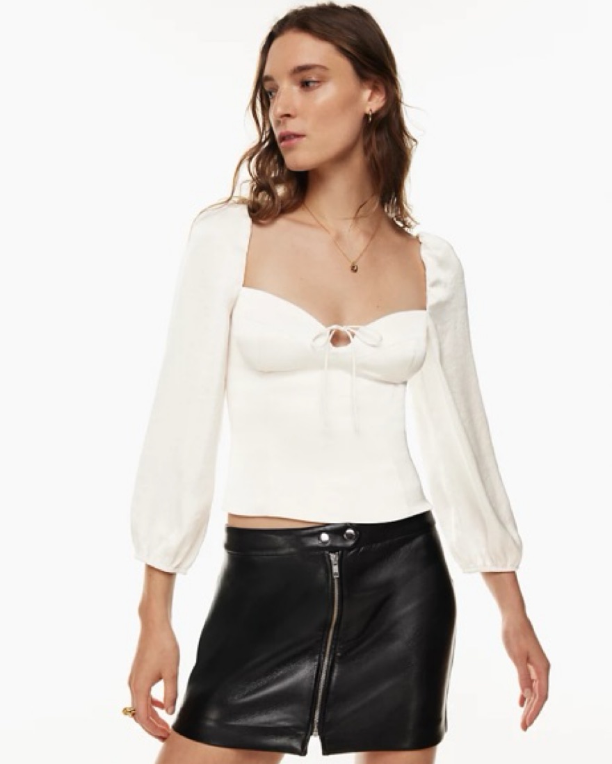 White sweetheart-neck blouse with puff sleeves with a cute bow! Super flattering and fits like a glove. Also available in brown!