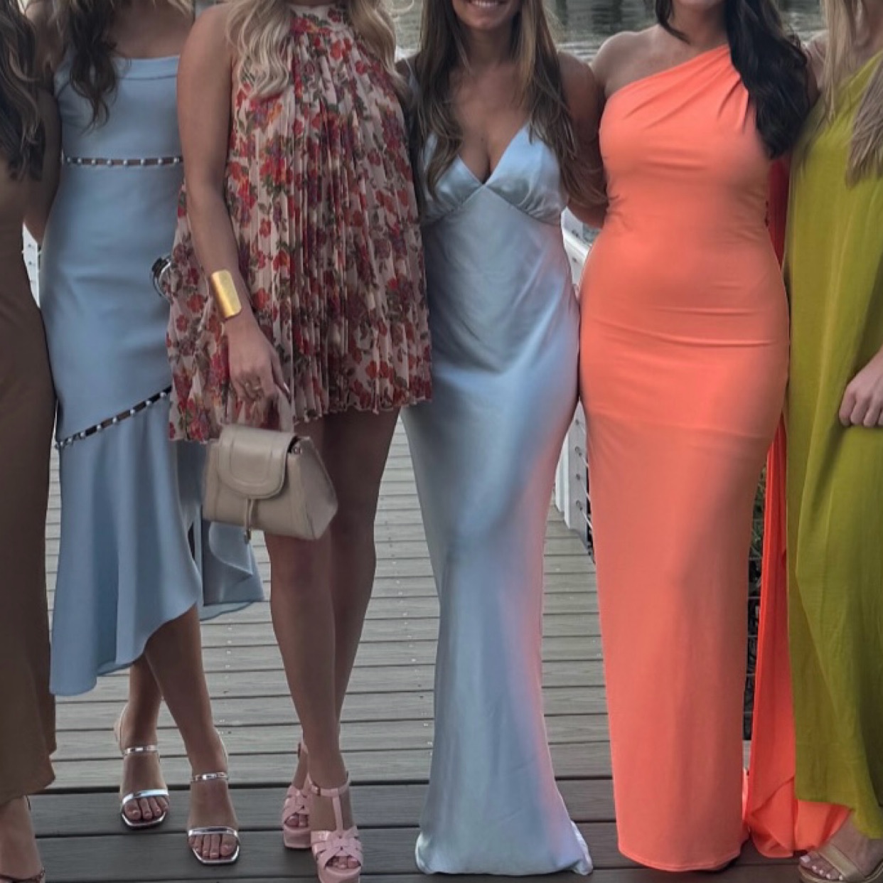 Light blue. Size small with adjustable straps. Tailored to fit 5’3 with 5 inch heels.