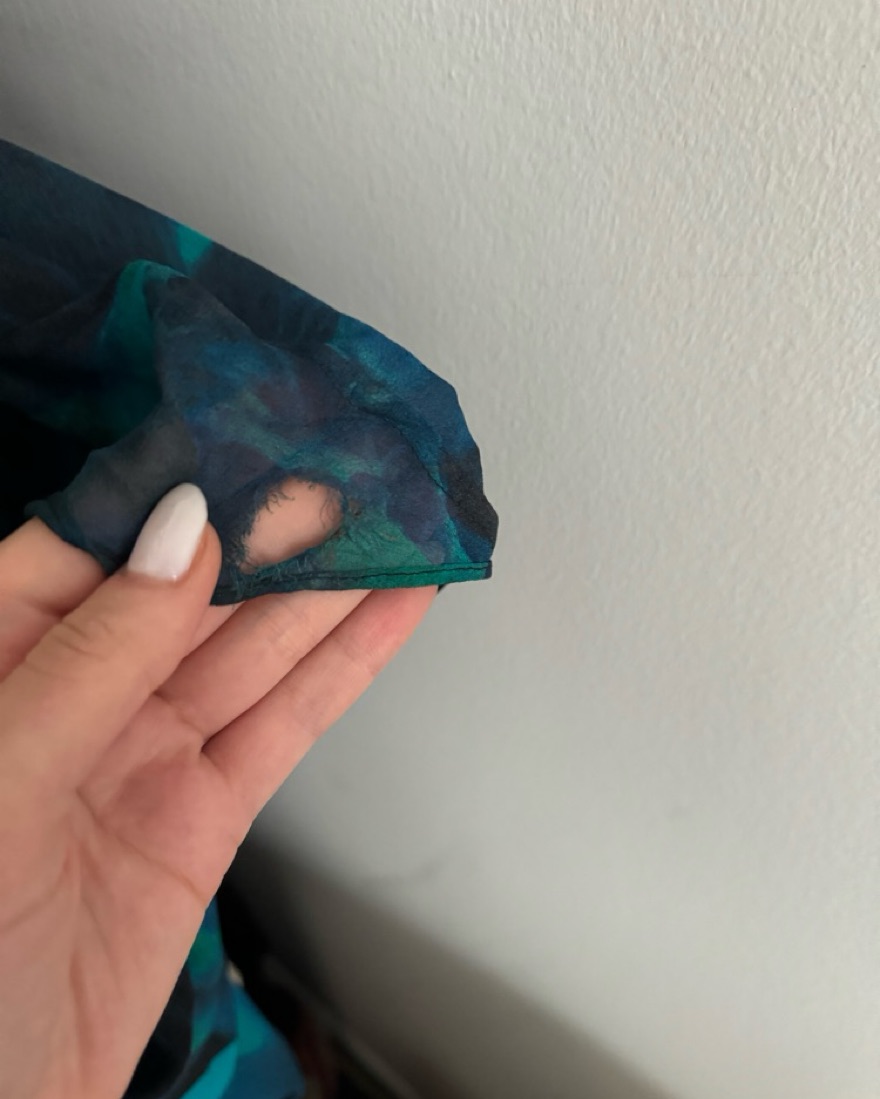 Perfect condition except for the hole at the very botton (pictured), which is reflected in the price:). Absolutely beautiful sillouhette and perfect for summer or vacation.