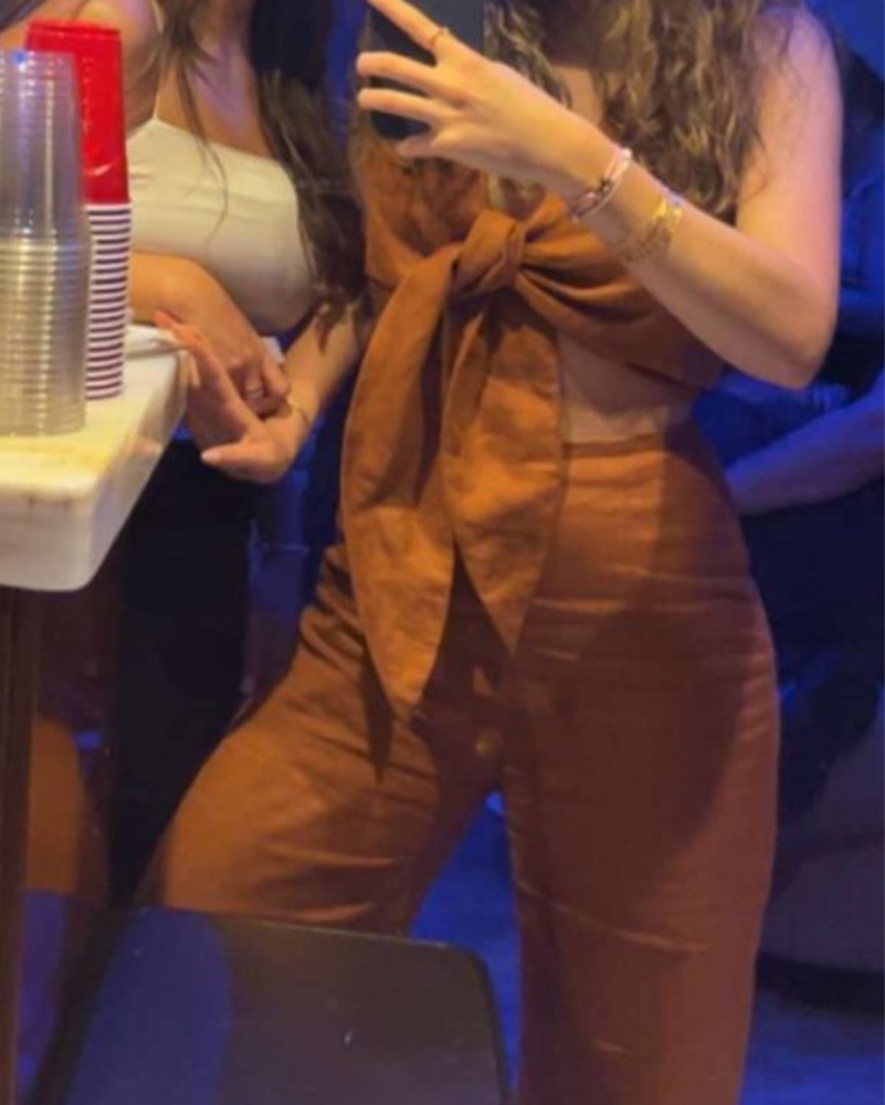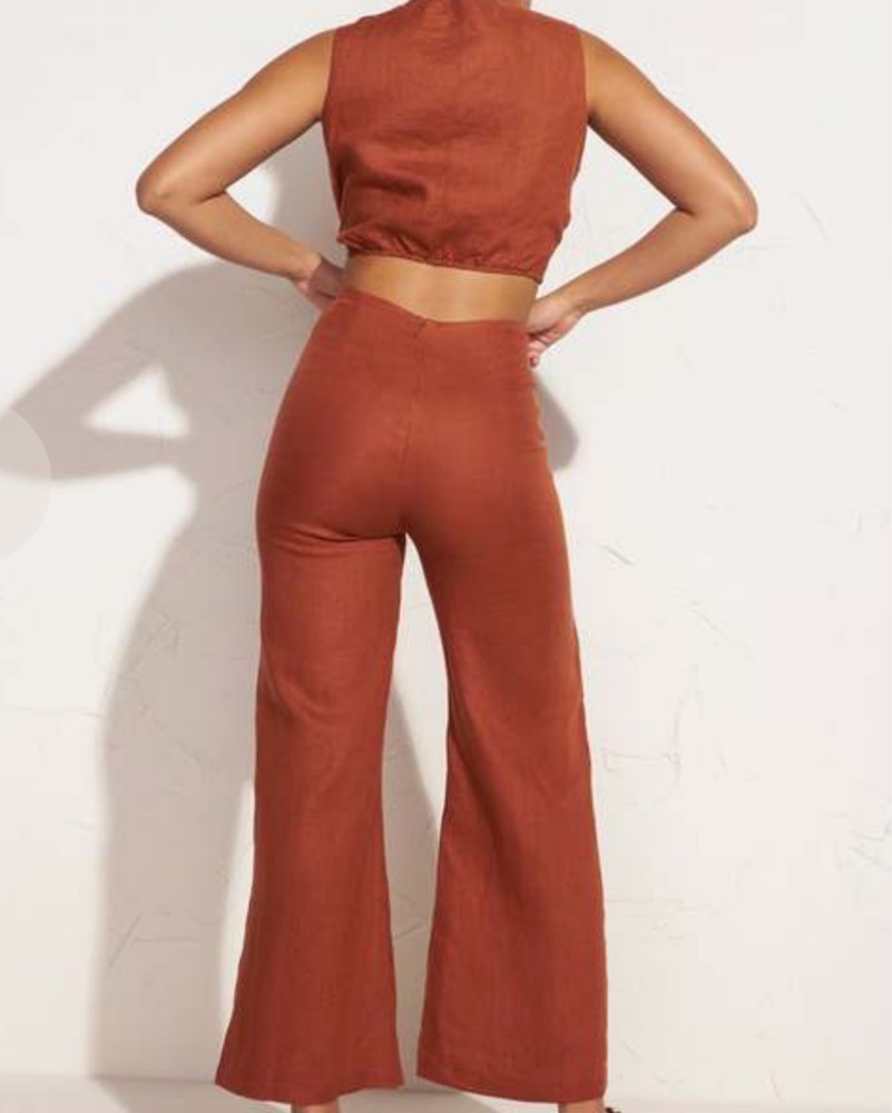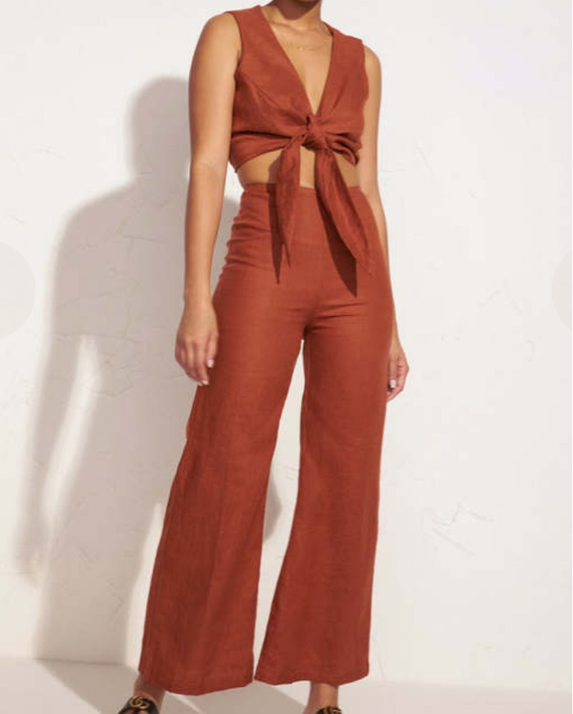 Brownish orange color. Fits an XS. Crop top tie front. Flare pants