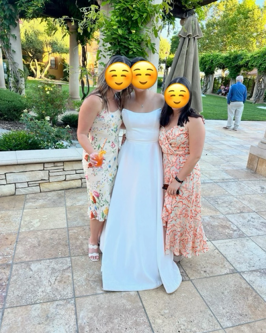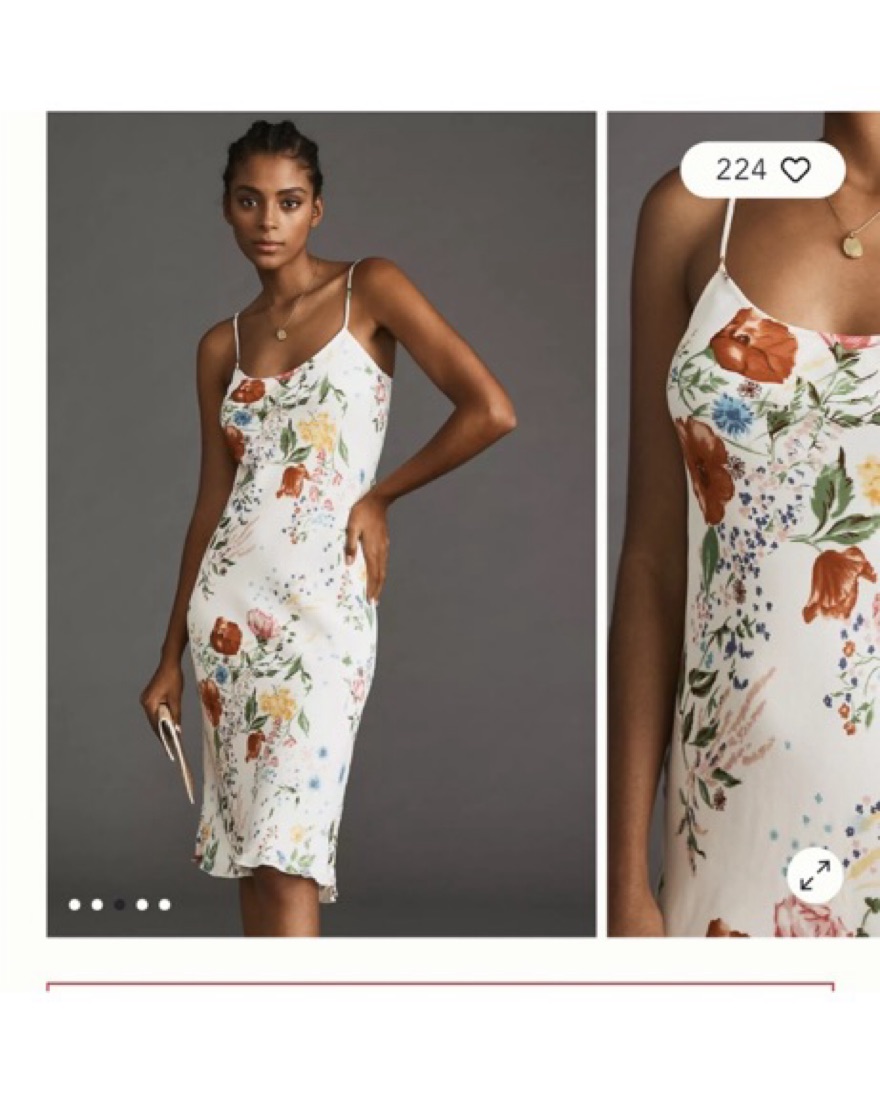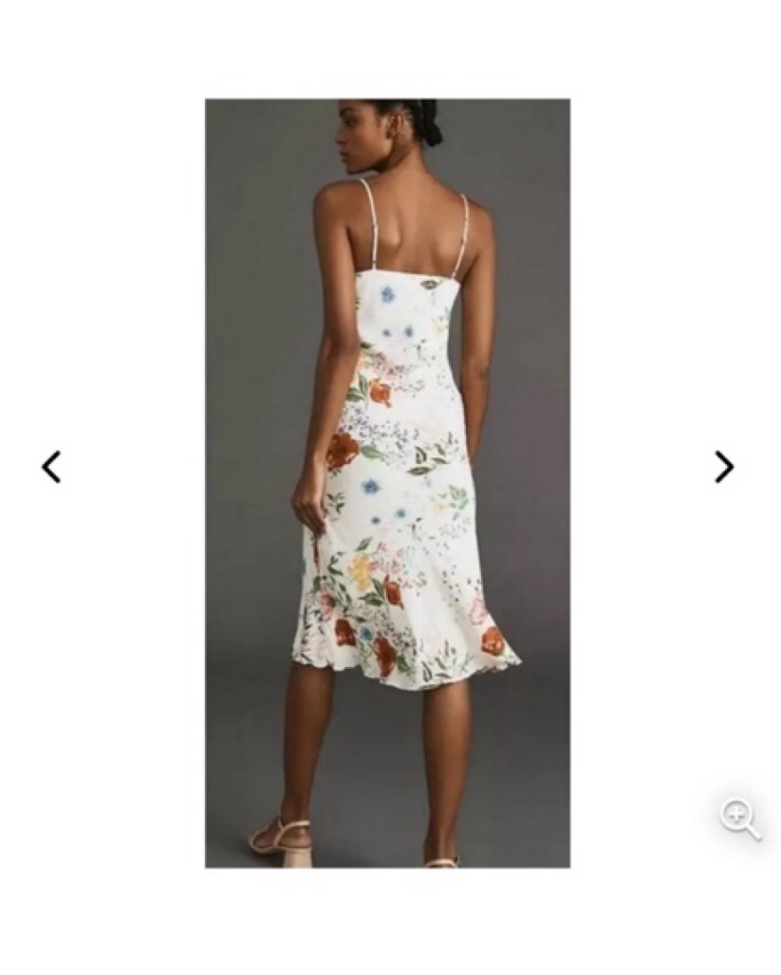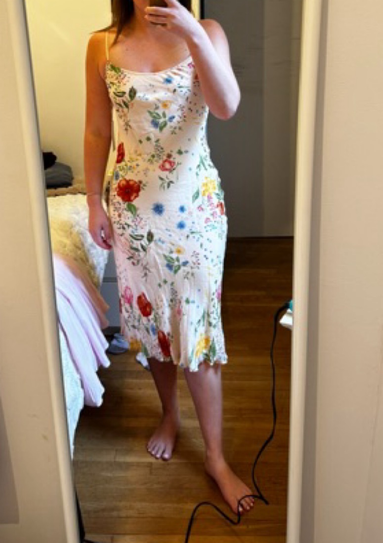 Reformation Emerick Dress - slip-style midi in a light tan with red / orange / yellow florals and blue / green accents. I’m 5’4” and hit perfectly below the knee.