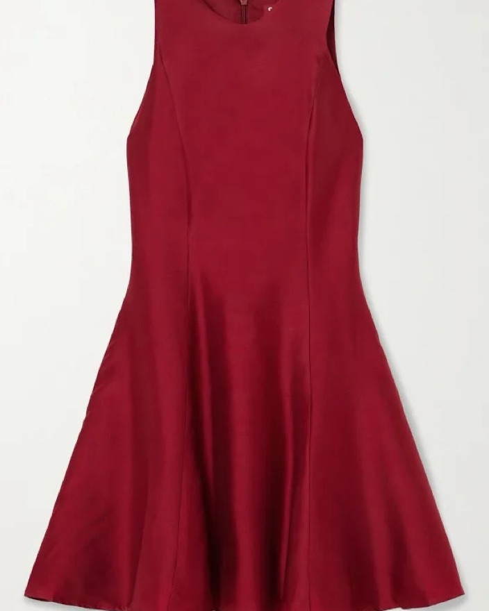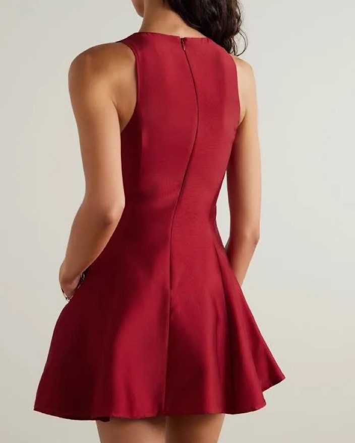 The STAUD Heike dress is paneled from faille. It has a fitted bodice and a gently flared skirt. It features a round neck and a sleeveless design. It is a mini dress and closes with a zipper at the back.