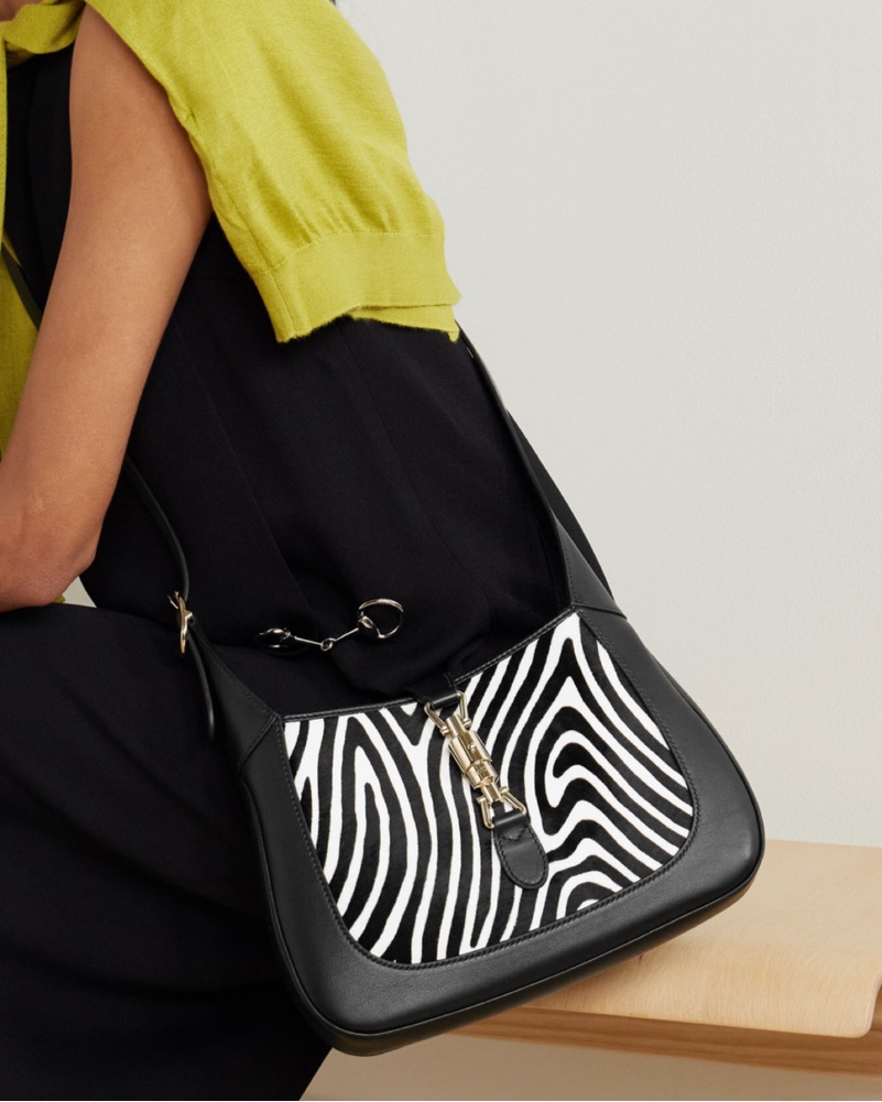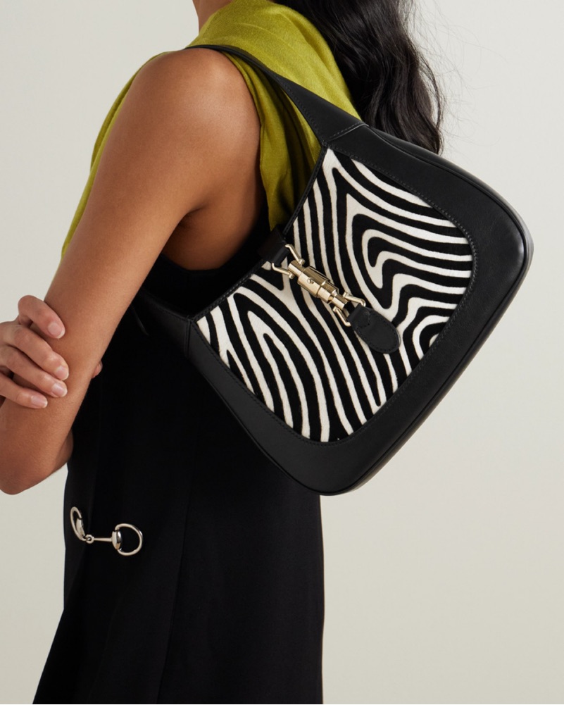 The classic style is crafted from a mix of leather and zebra-print calf hair, accented with a piston clasp. Perfect pop of pattern and can fit a decent amount of stuff