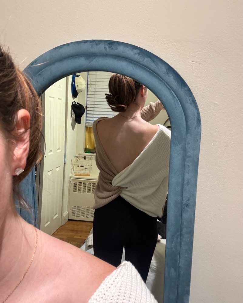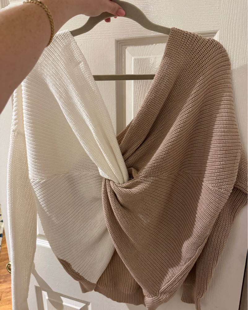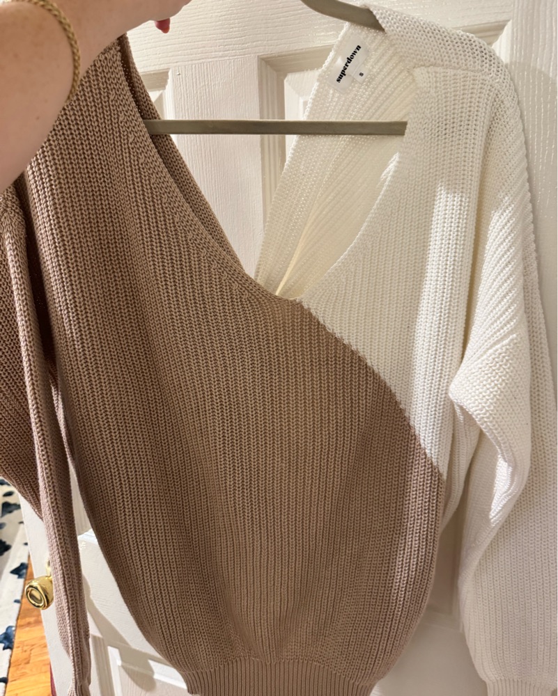 white and brown super down sweater. knot in the back which can also be worn in the front. Size small