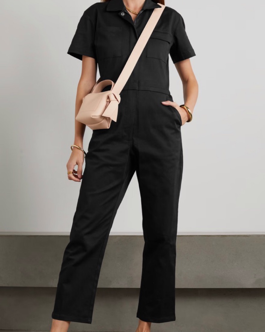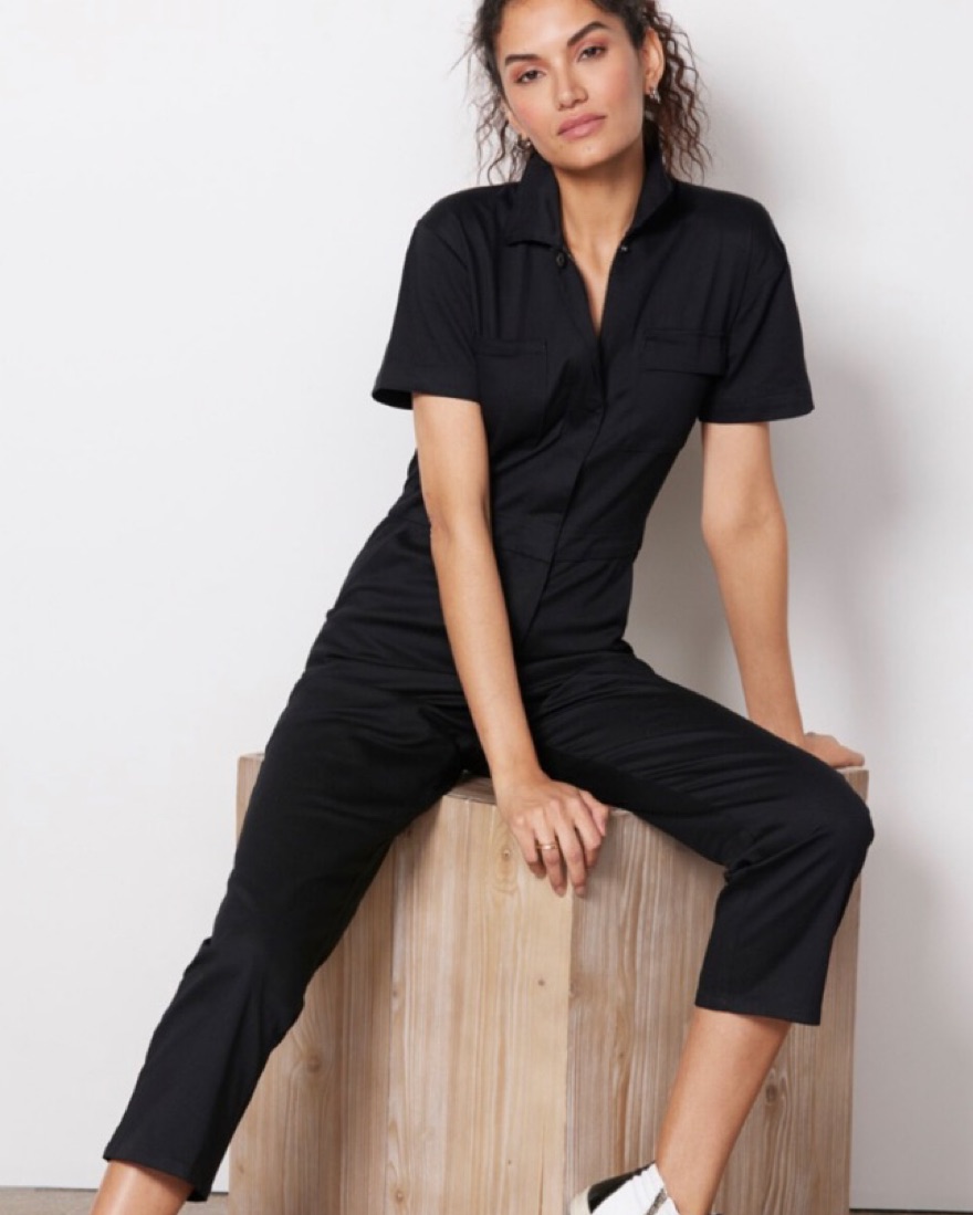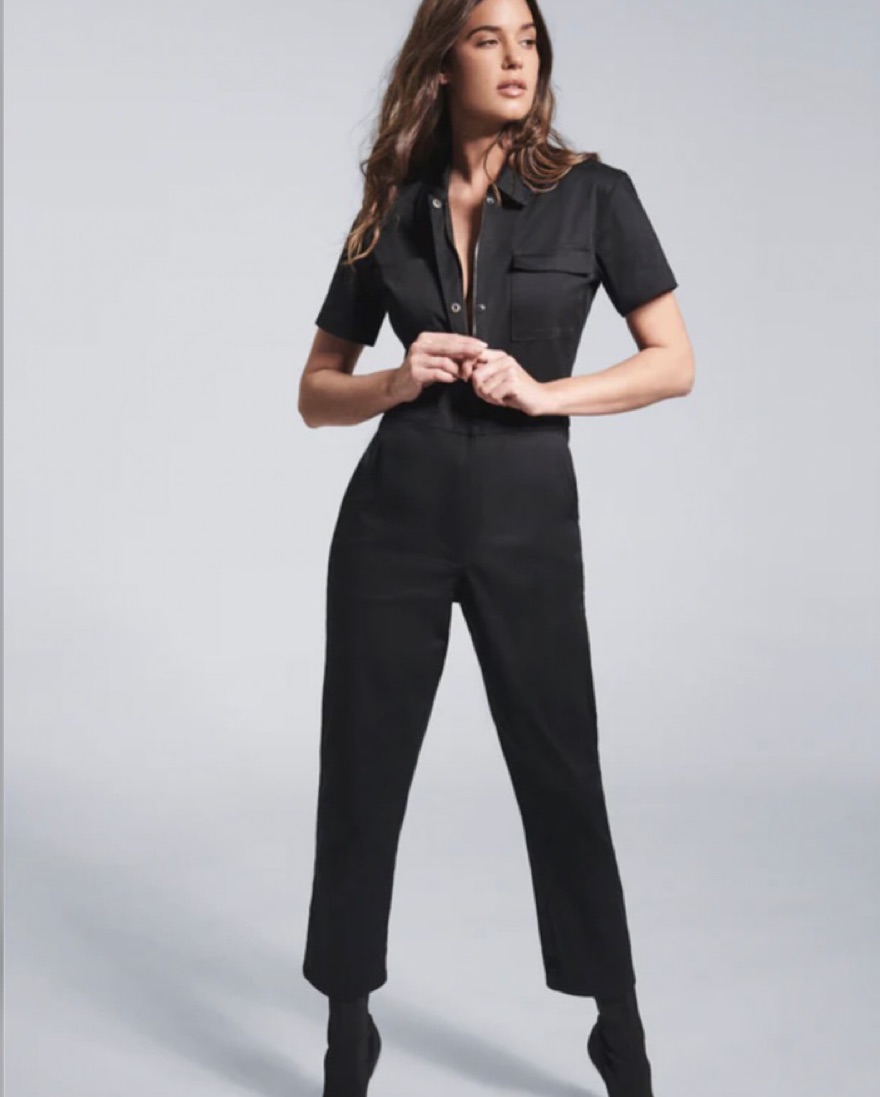 Comfortable, versatile stretch cotton jumpsuit. Perfect for day to night. Hidden zipper down the front to wear open or closed.