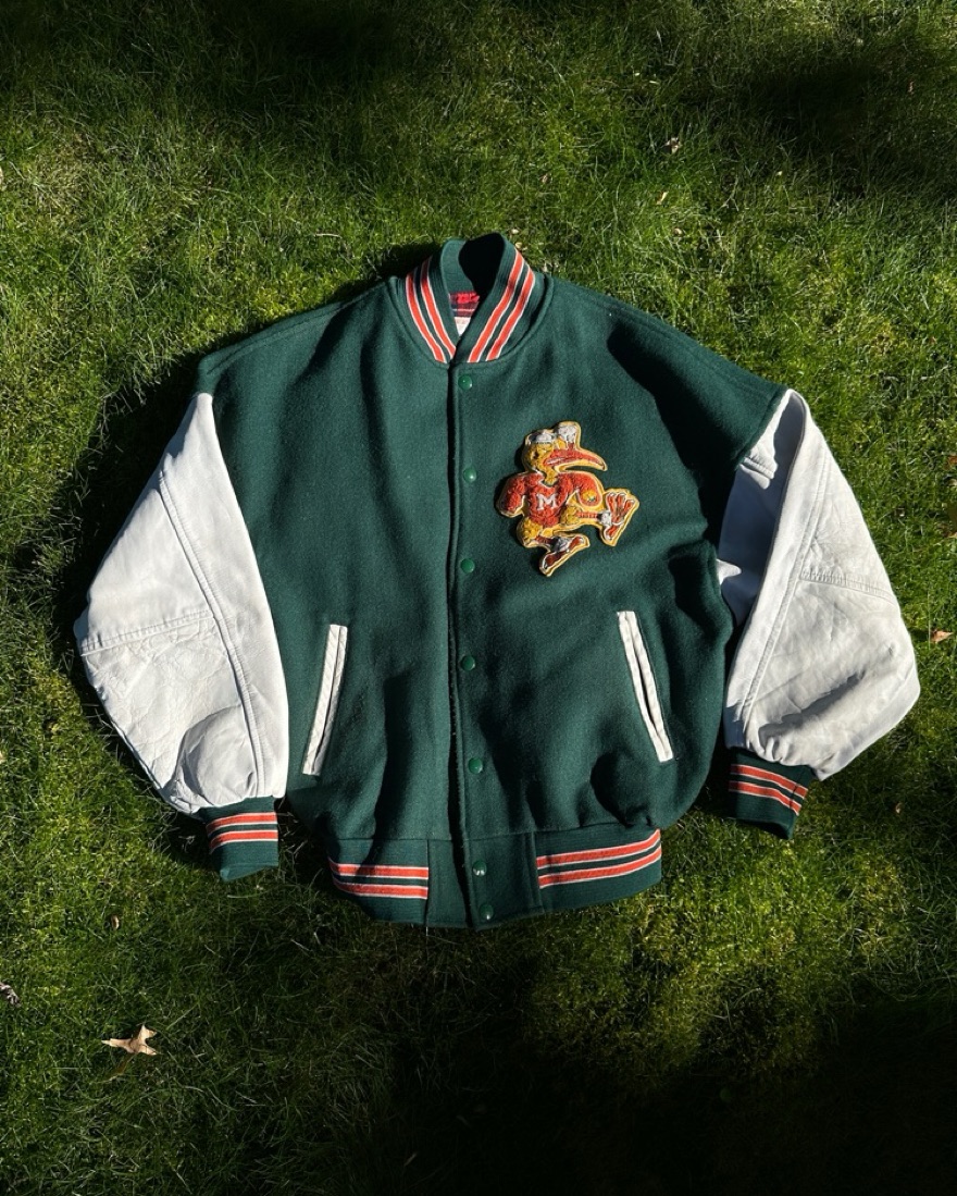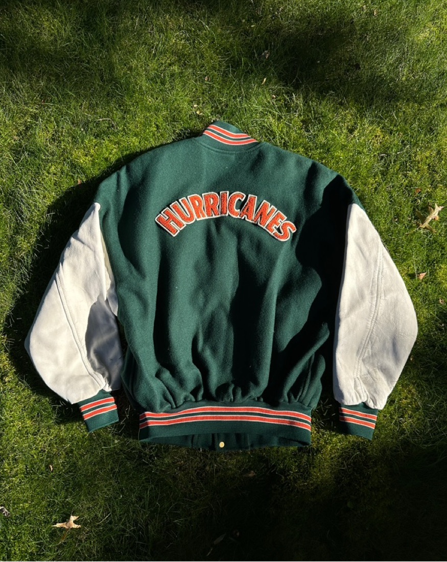 University of Miami (UMiami) Hurricanes vintage green bomber jacket with white distressed leather sleeves, sourced by Tailgate Teens on IG. Whether you’re getting ready for an upcoming tailgate or looking to elevate your street style with a vintage piece, this is perfect for you. Go Canes!