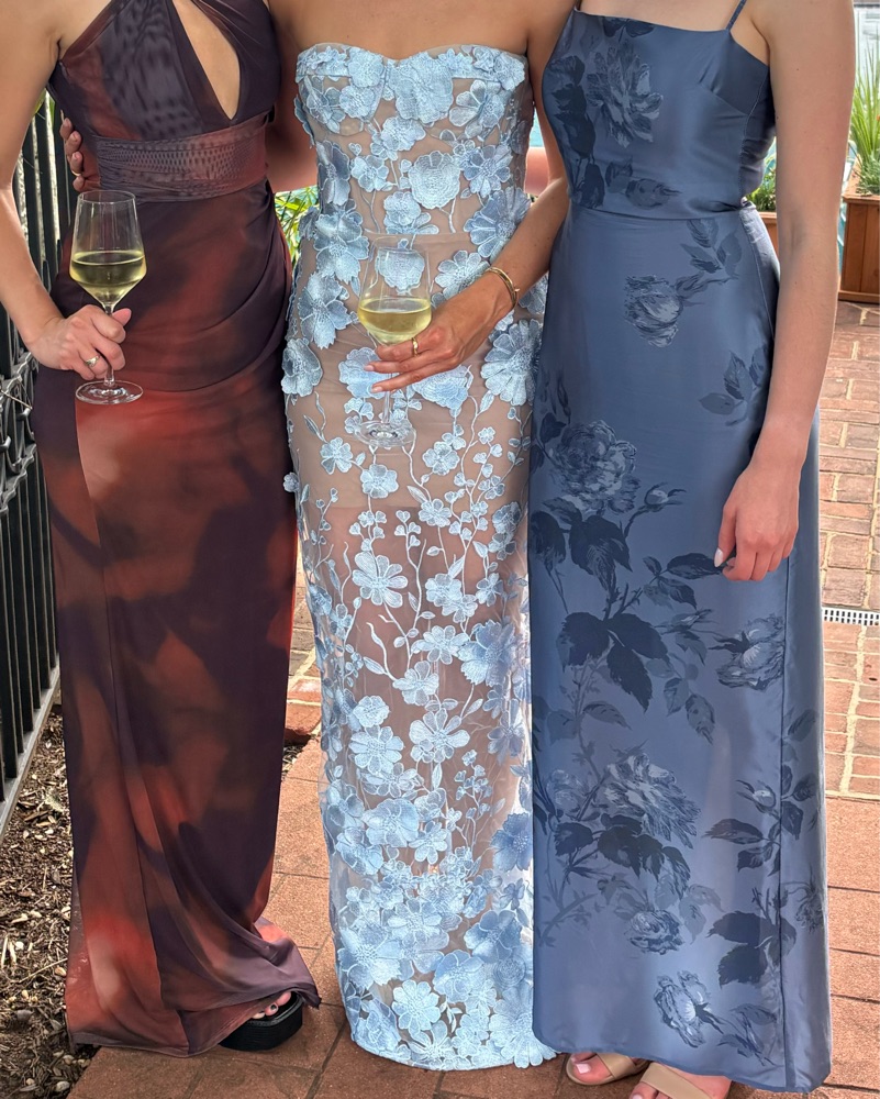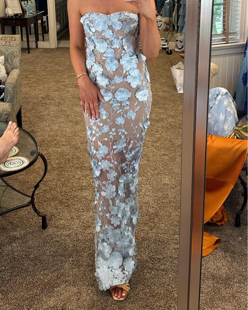 Stunning Bronx & Banco floor length light blue dress. Only worn once and dry cleaned, like new condition, with a slit added to the left side seam up to the knee. Baby blue in color with a mid/thigh nude slip underneath. Perfect for a wedding as a guest or bridesmaid, or other black tie event!