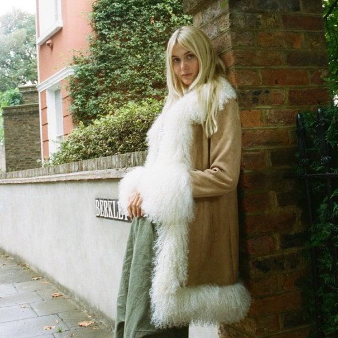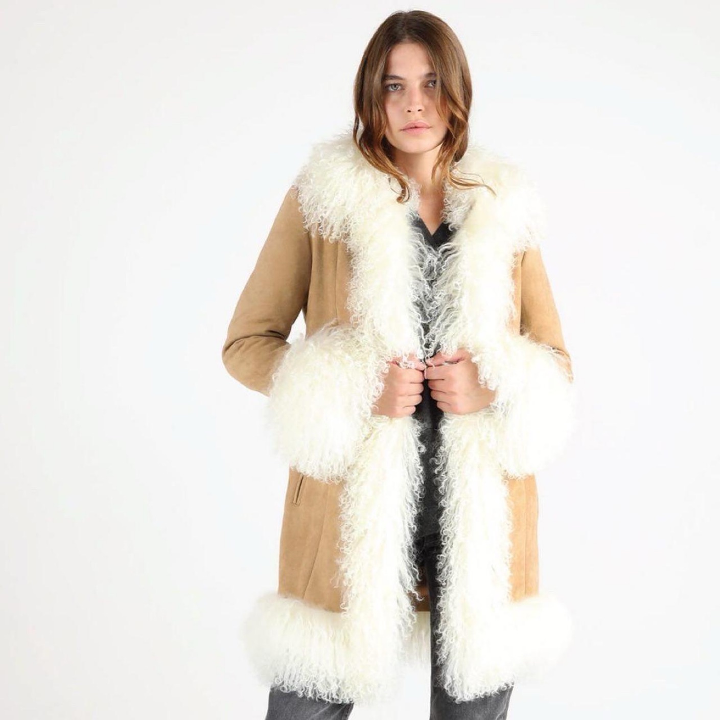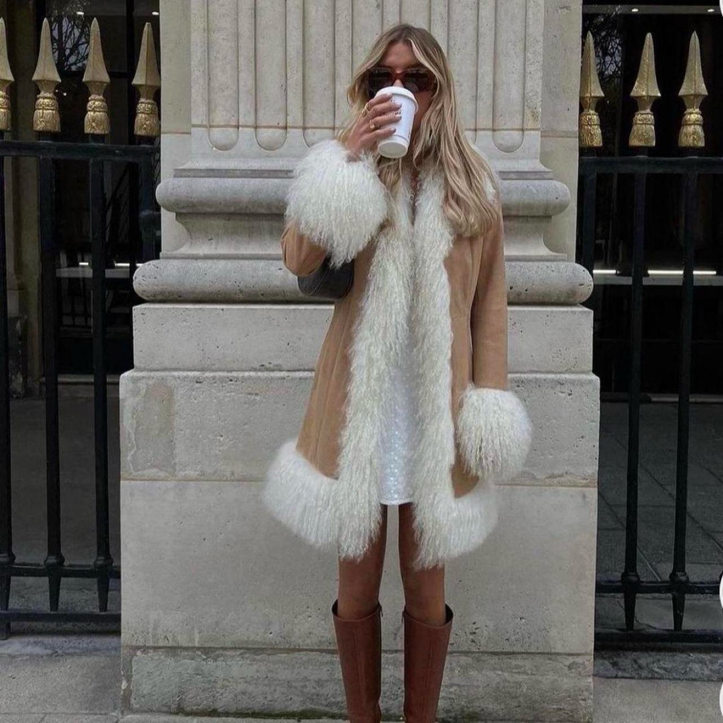 Tan suede coat with white fur trim detail
