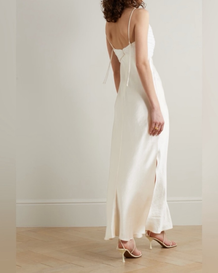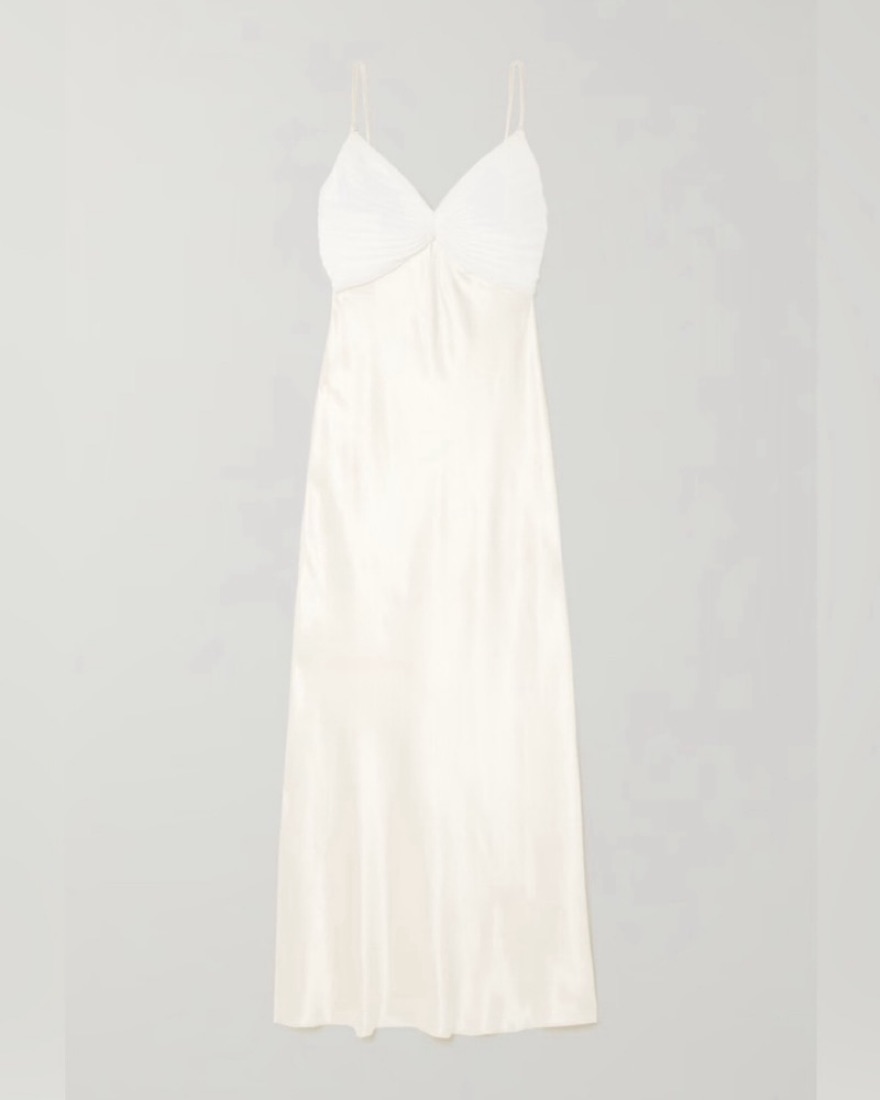 It's cut on the bias from smooth satin for a figure-skimming fit and has a pleated georgette bodice that resembles a bow. Adjust the knotted straps to find your perfect fit.