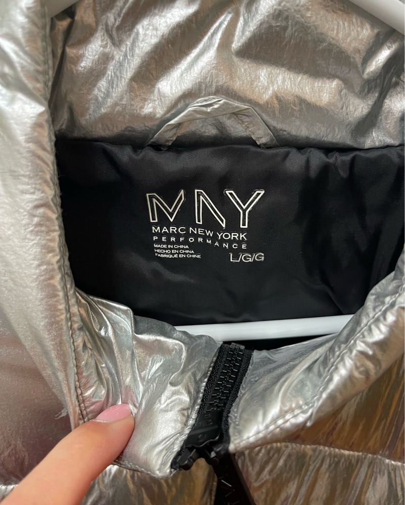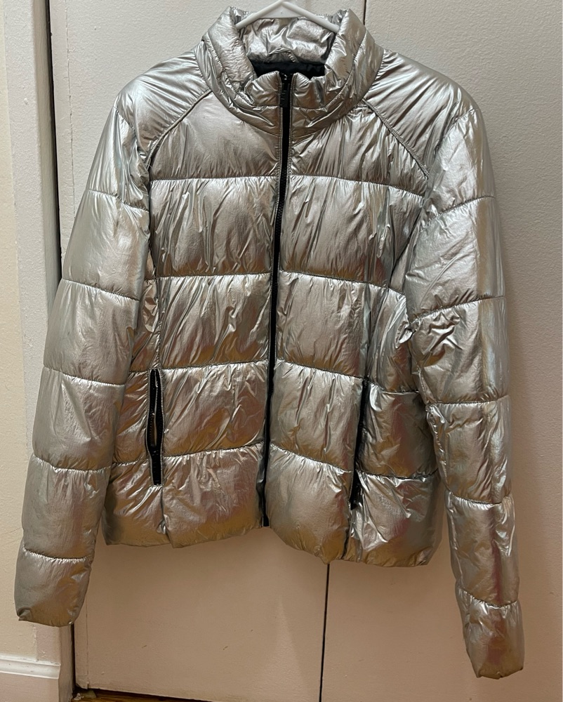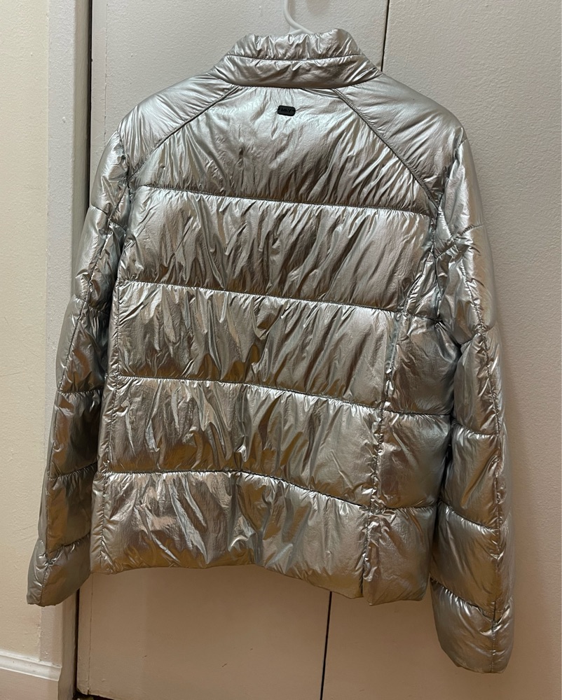 Marc Jacobs silver reflective puffer jacket. Incredibly warm feather jacket- size large, would fit sizes 2-8 comfortably.