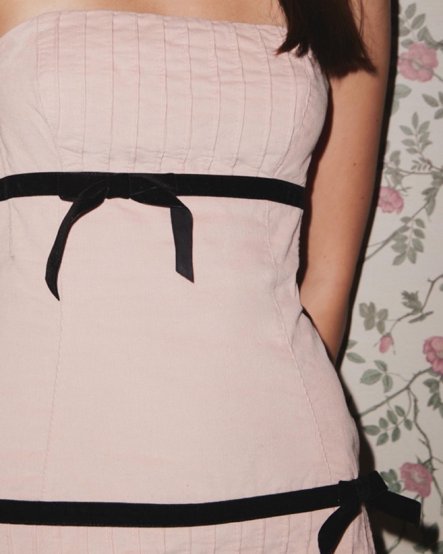 Color is “rose.” Lightweight mini dress from Kimchi Blue. Cut short in a fitted silhouette with a strapless neckline. Finished with pleated detailing and contrasting bows throughout. Only available at UO urban outfitters