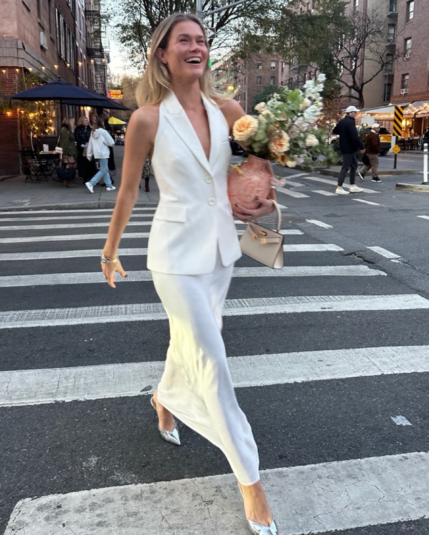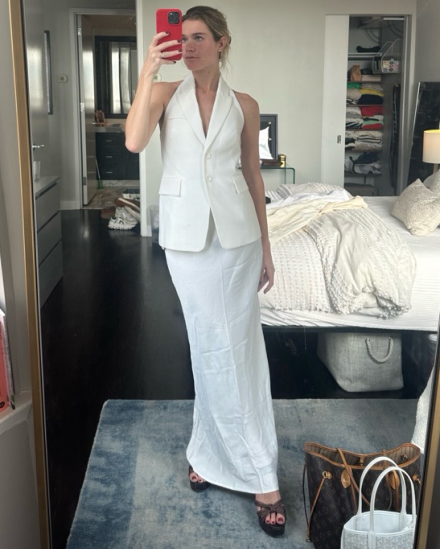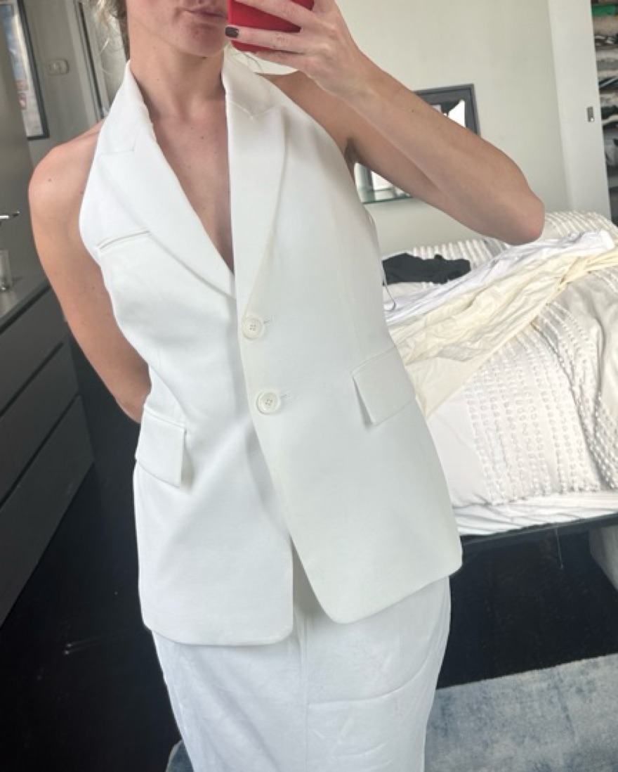 Halter white blazer shirt. (Super thick material) - paired with a white silk skirt, if you want to rent with the skirt also, include in message! Anthro size small.