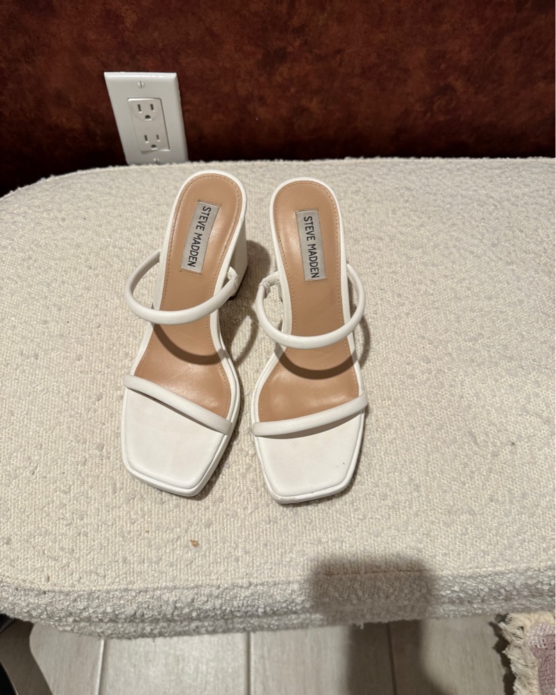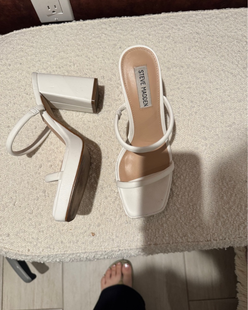 These stylish white mules would be perfect for a special occasion or a night out. The square toe and chunky heel add a modern touch.