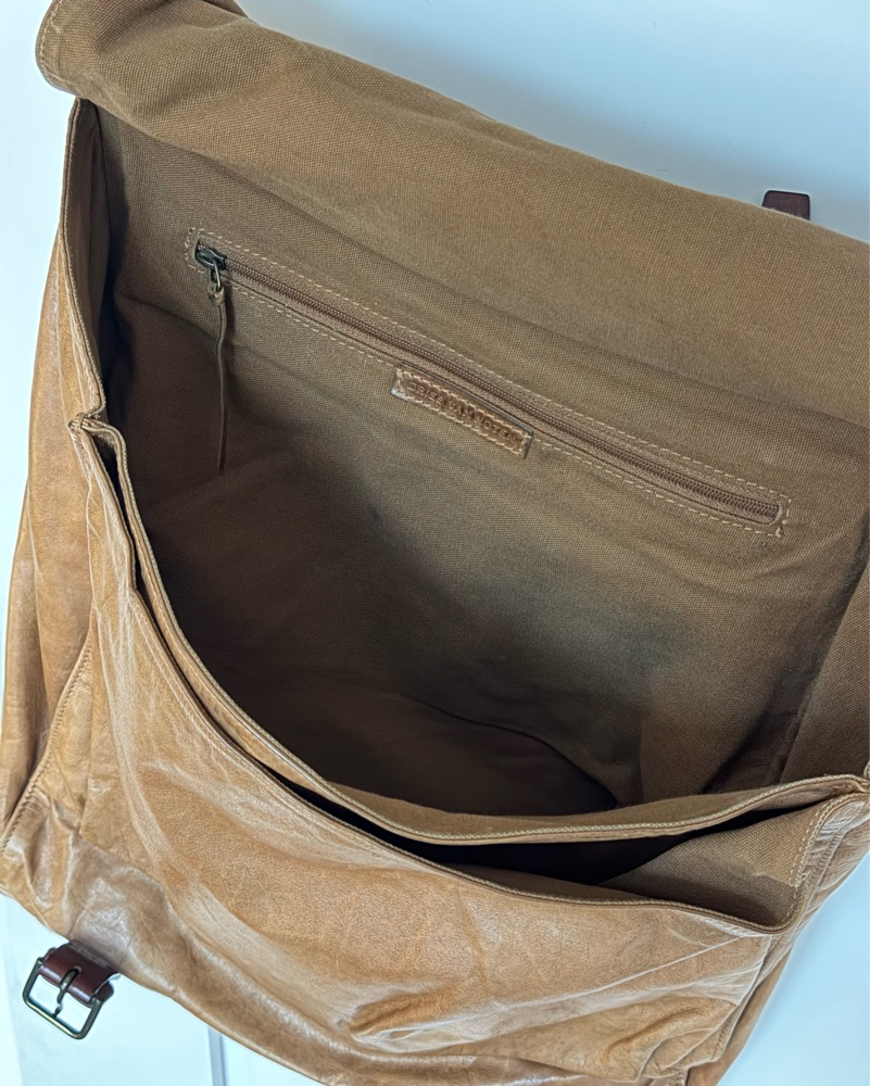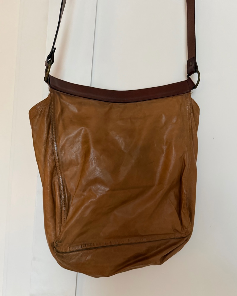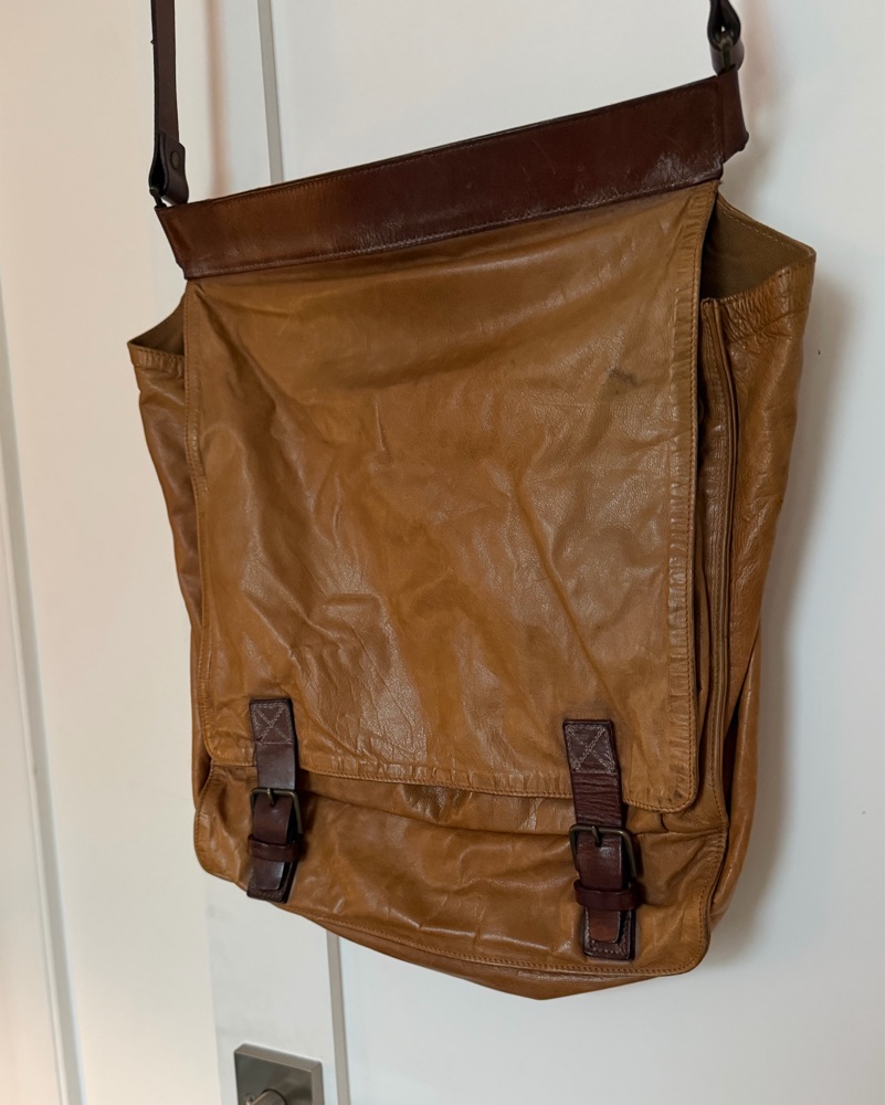 Vintage Dries Van Noten 100% leather messenger bag in camel with rich mahogany brown strap accents. Spacious main compartment, artisanal craftsmanship, and timeless patina from use. Good vintage condition.