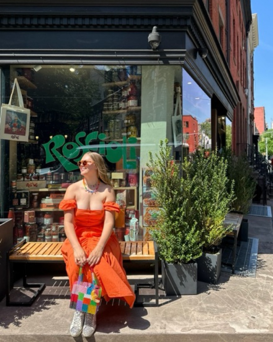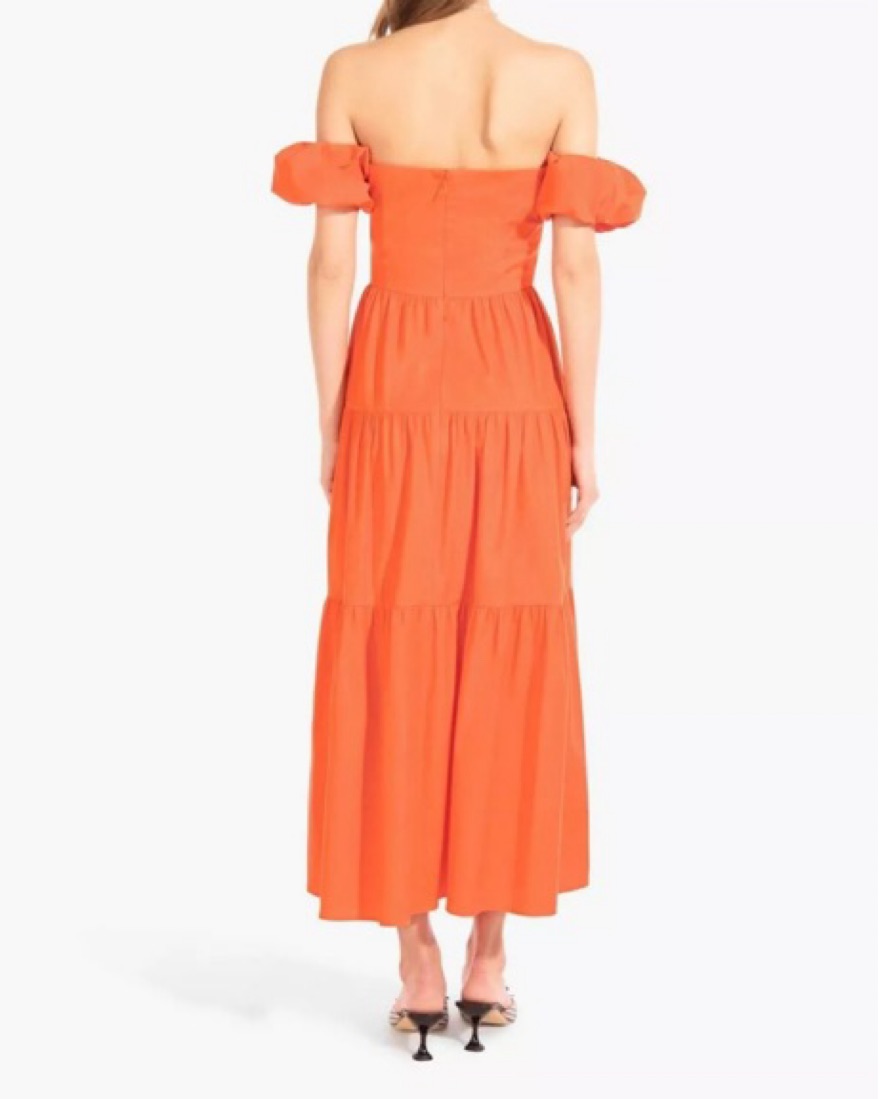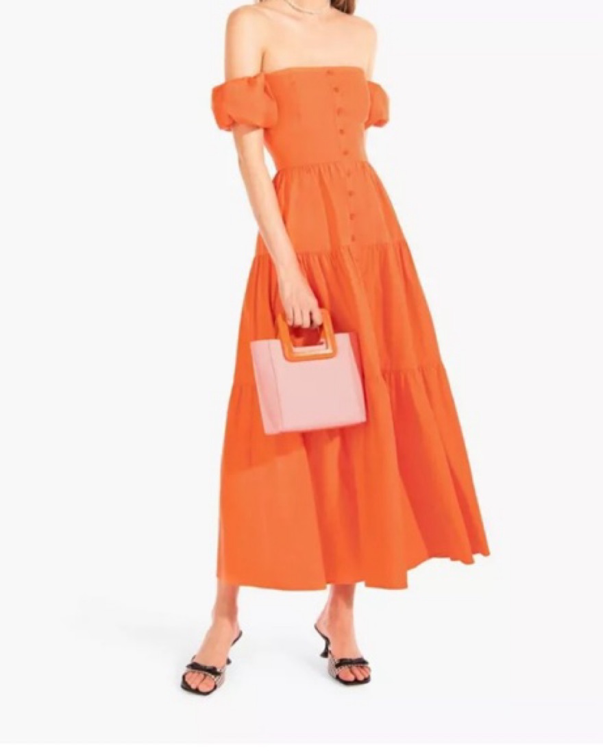 STAUD Elio dress with tiered skirt, button detailing, and puffed sleeves that can be worn on or off the shoulder. Gorgeous tangerine colorway that is sold out everywhere! Size 8, but could comfortably fit a size 6. Perfect summer maxi that can be dressed up or down! Also available to rent in black.