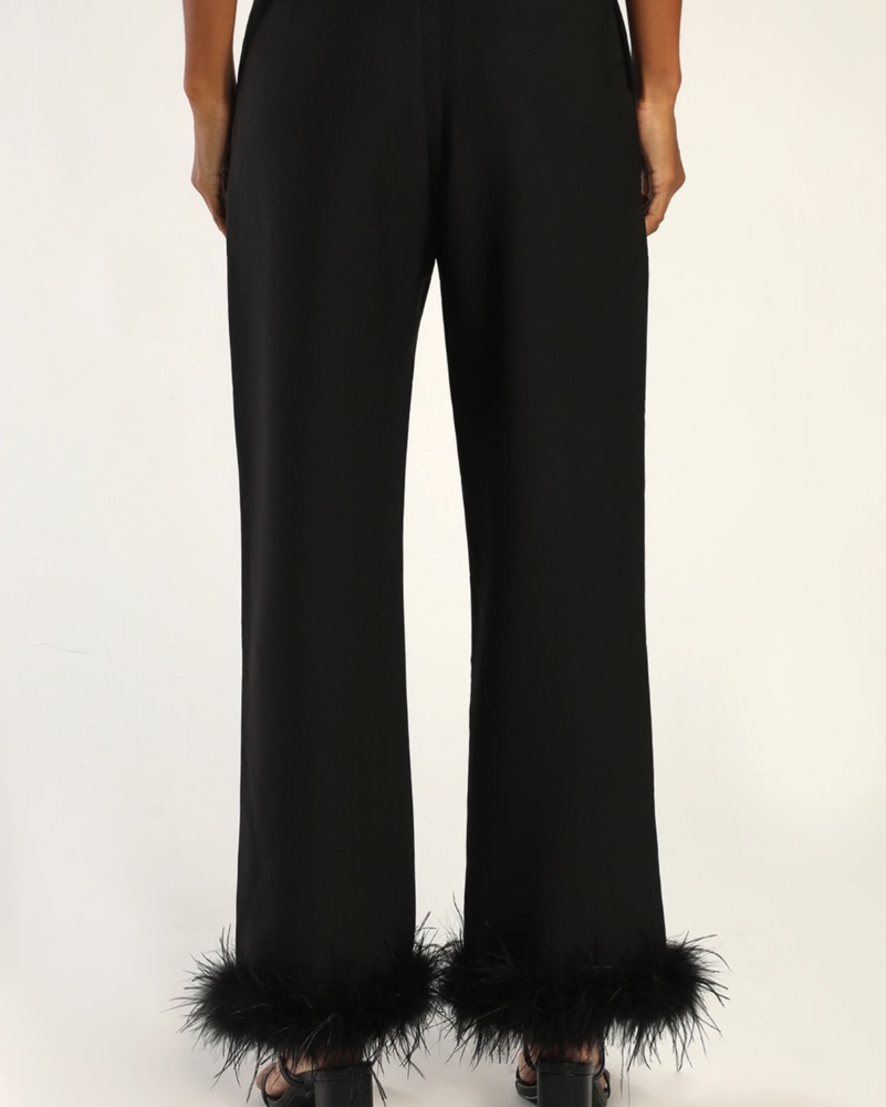 These sophisticated black pants with feather trim are perfect for a night out or special event. The flared silhouette and luxurious feel add a glamorous touch.