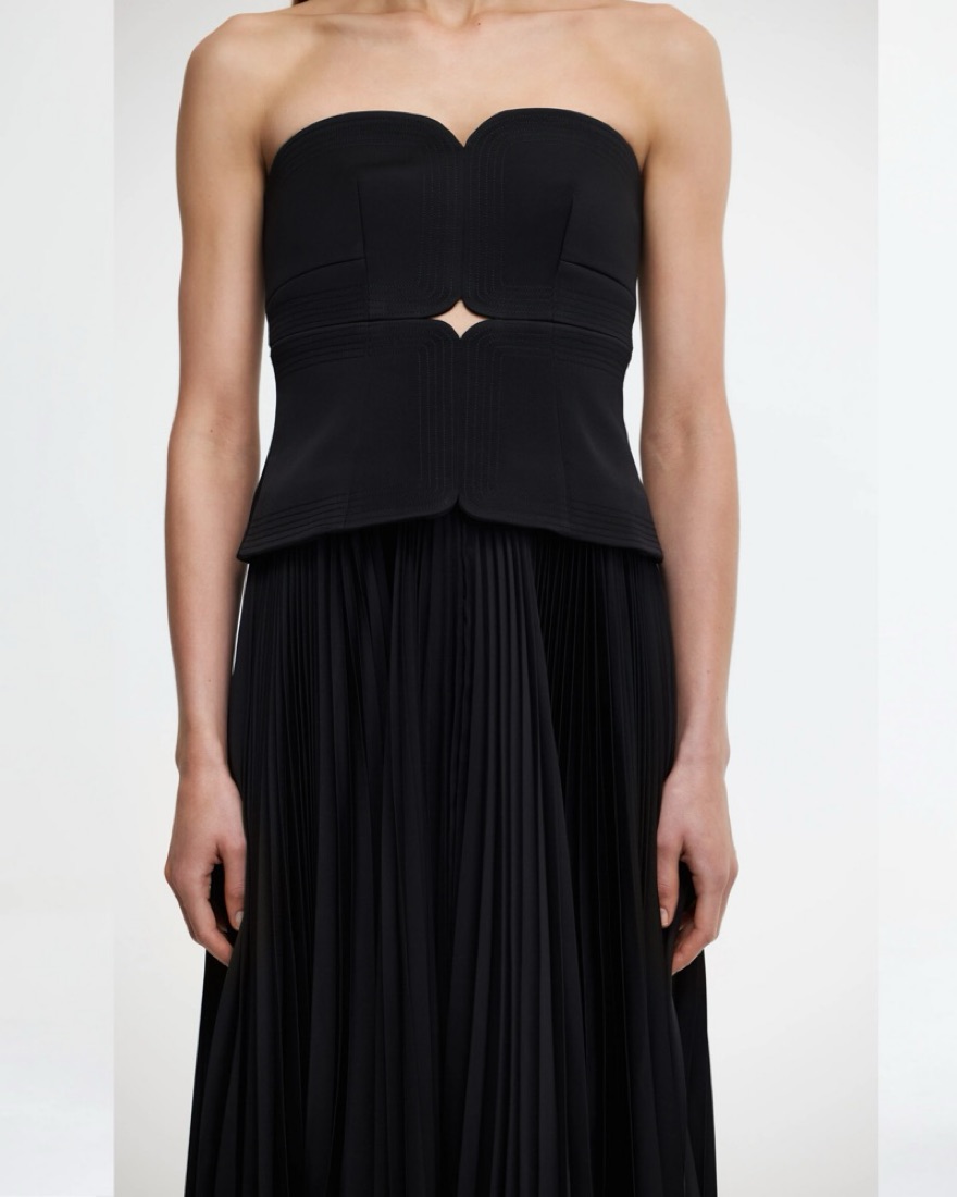 AU 8/US 4 fits S/XS. Super flattering! Strapless black dress. Please wear with care. Tags: black formal dress, black wedding guest dress, strapless formal dress. Black prom dress