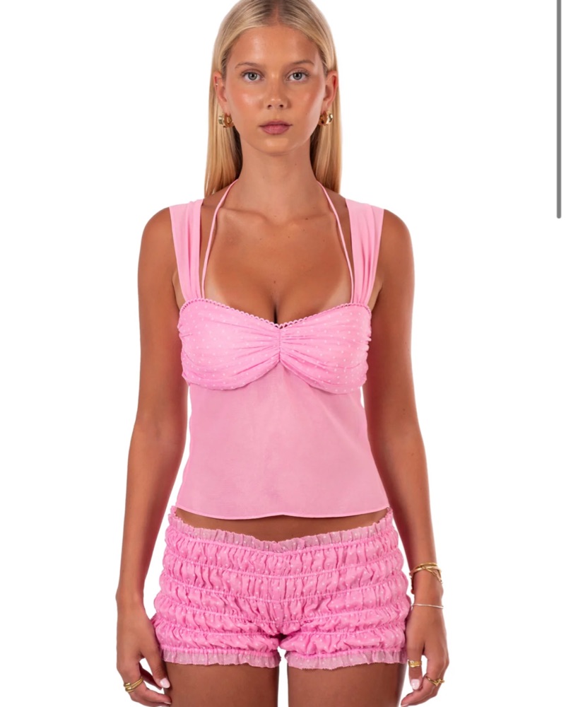 The cutest and most perfect summer set!!! Pink with polka dots. Top is XS Bottoms are S (model in picture is wearing this size! PLEASE NO SELF TAN!! She is very delicate and self tan willl ruin her 🥹