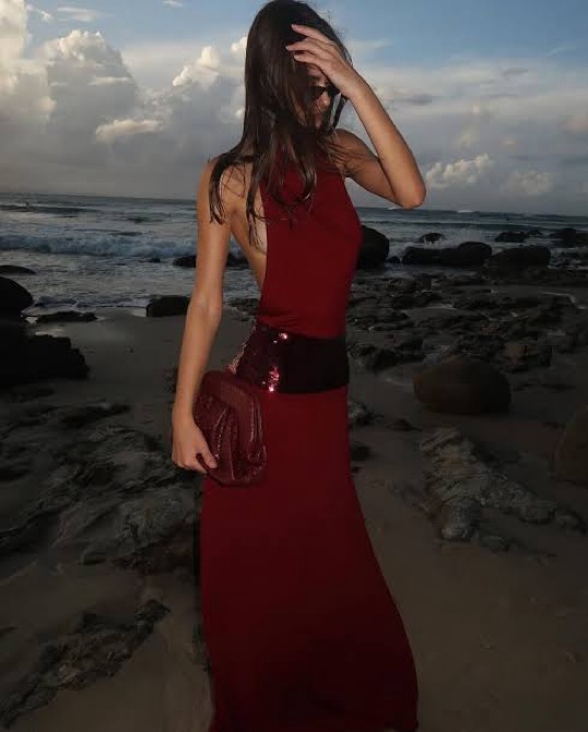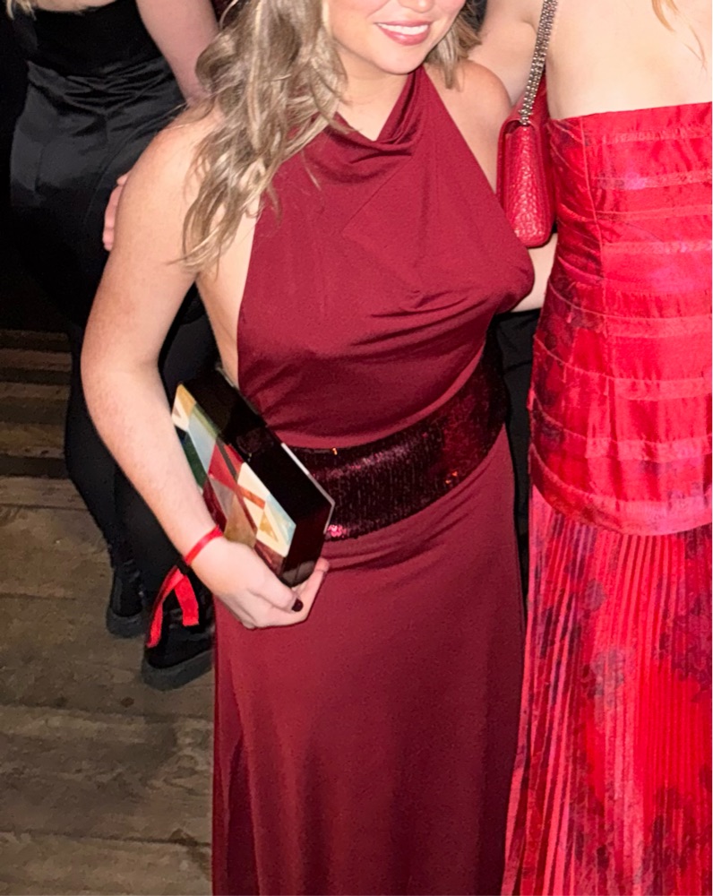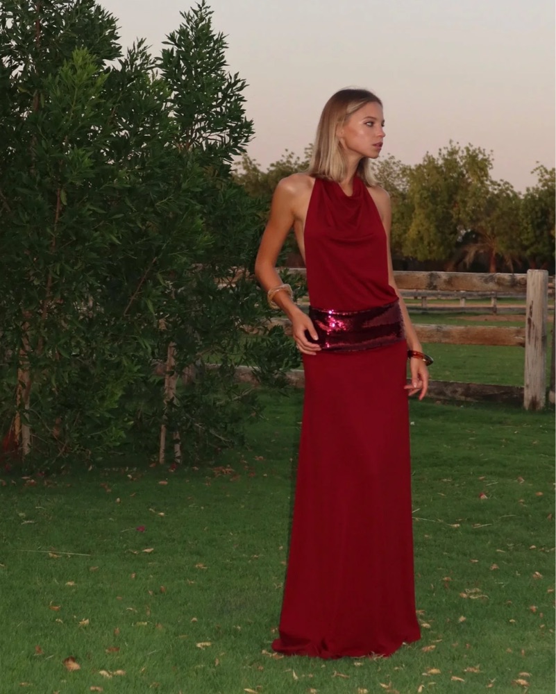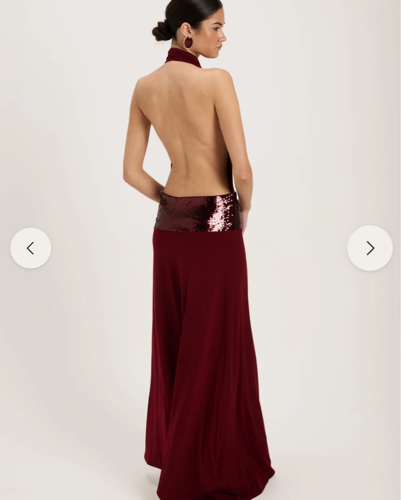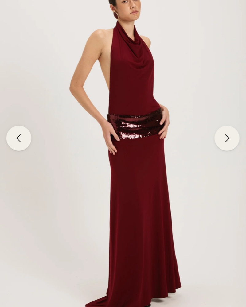 halter gown with a draped cowl neck, open back, and low-sitting sequinned waistband that hugs the hips. The fluted skirt falls asymmetrically. Dry cleaning included in price