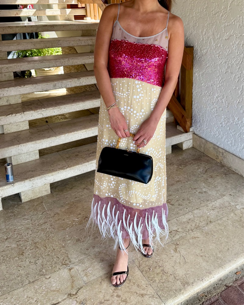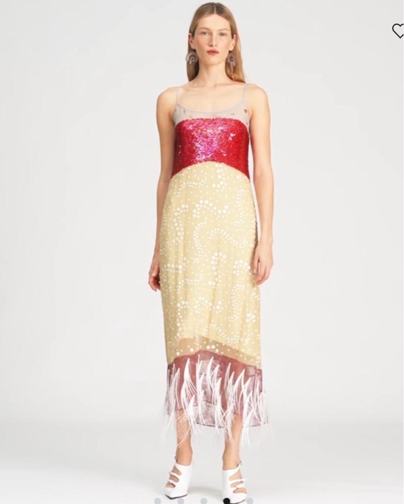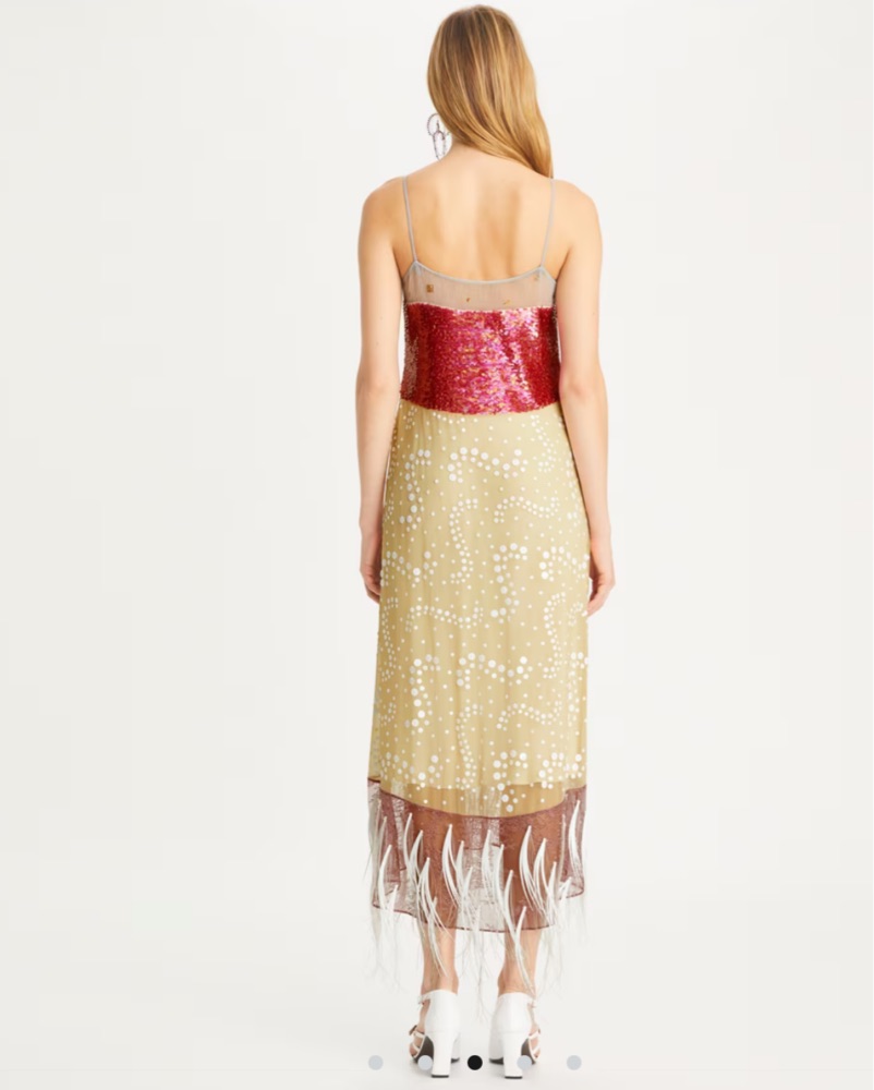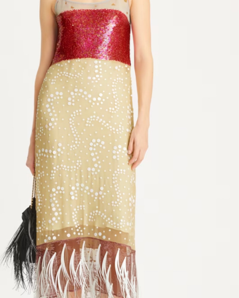 Texture, dimension and shine. Crafted with panels of pebbled organza, silk chiffon, and chantilly lace, the embroidered slip dress is perfect for holiday parties. Embellished with crystals, paillettes and long feather-like sequins. Bodice: 100% polyester organza; upper portion of skirt: 100% silk ch