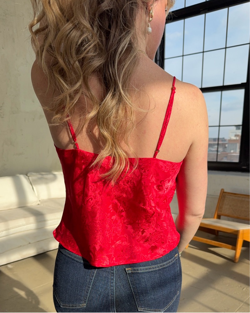 Victoria’s Secret Red Gold Label cami in paisley satin with lace trim at the neckline and center, satin button-down front, and adjustable straps. Elegant and versatile. Second-hand garment.
